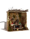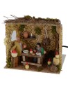 Escena de una taberna con dos personajes en movimiento, funcionando con corriente. La escena está llena de detalles: en primer plano vemos a dos hombres, uno sentado y otro de pie, bebiendo vino y, gracias al movimiento de su brazo hacia arriba y hacia abajo, simulan precisamente la acción de beber del vaso. Otros elementos característicos de la escena son la mesa en la que están comiendo, equipada con muchas miniaturas, las diferentes garrafas de vino y los barriles alrededor, una estantería con una ánfora y un candelabro, y dos salamis y dos quesos colgados, que hacen que la escenografía sea muy sugestiva y realista. La escenografía está delineada por tres paredes de corcho con efecto piedra y un techo de ramitas de madera apiladas, una puerta y una ventana. La estatua está realizada en terracota y pintada a mano en Italia por manos artesanas con ropa de tela. La estatua para el Pesebre clásico y/o napolitano en pie mide 10 cm, mientras que la sentada mide 7,5 cm y se caracteriza por el uso de materiales como la madera, el corcho, la tela y la terracota; forman parte de la serie de estatuas de 10 cm.