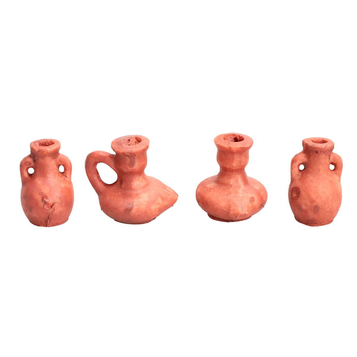 Set of four terracotta amphorae for nativity scene, crafted in different shapes.