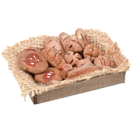 Wooden box with pizzas and bread on twine fabric, recommended for nativity statues height 20-24 cm.