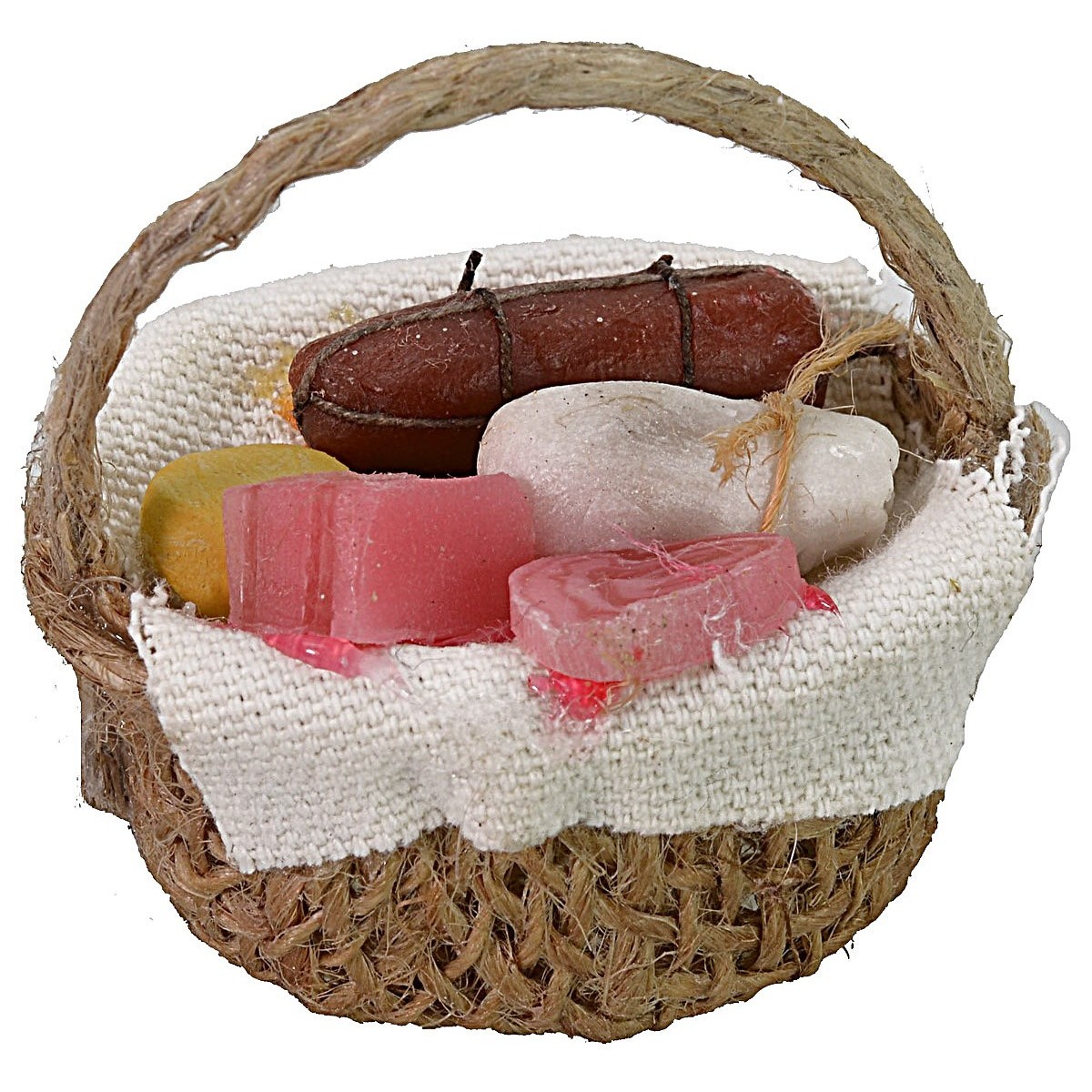 Jute basket with processed wax salami and cheese, recommended for nativity scene statues 15-20 cm high. Being a handmade product, the sizes and colors may vary slightly from the photos.