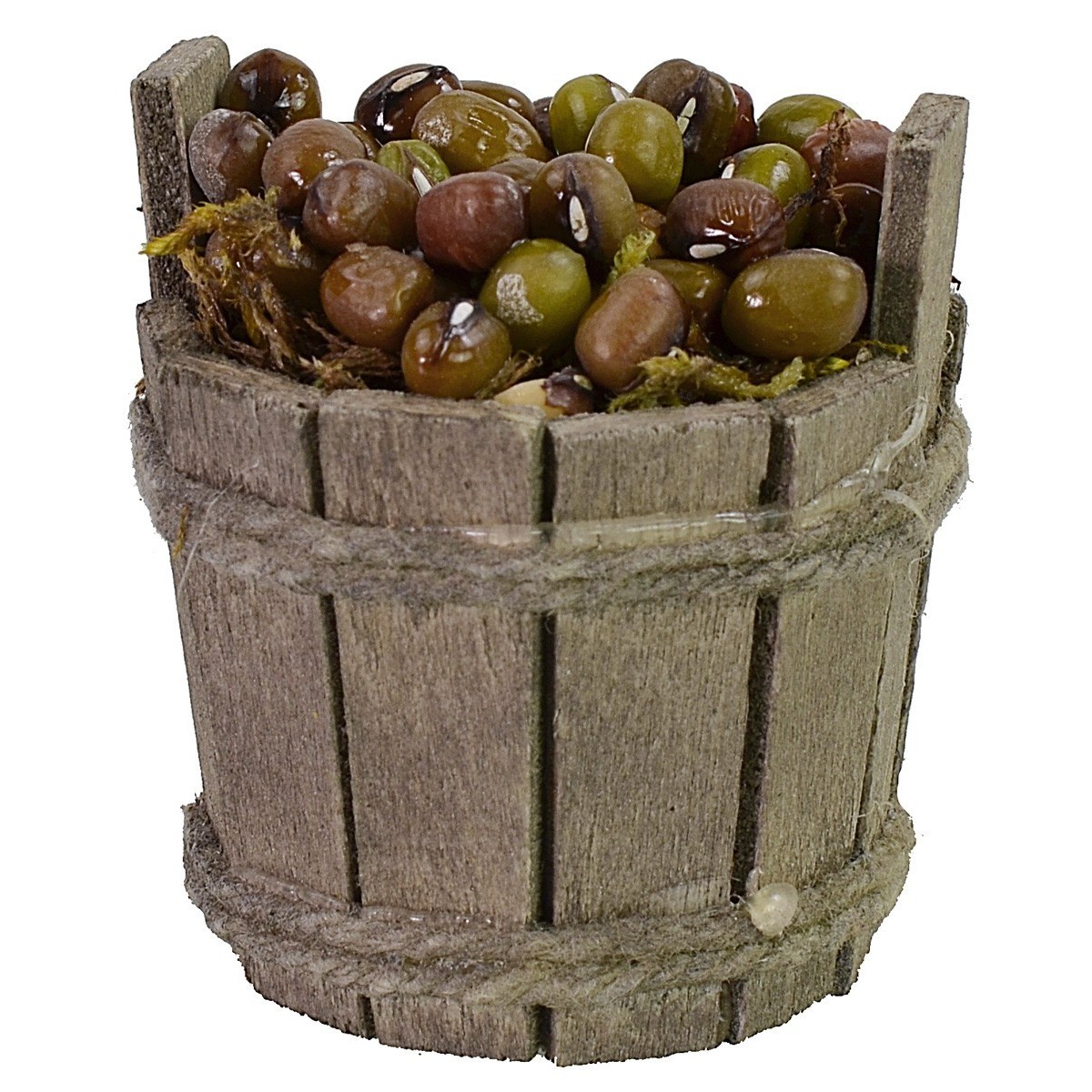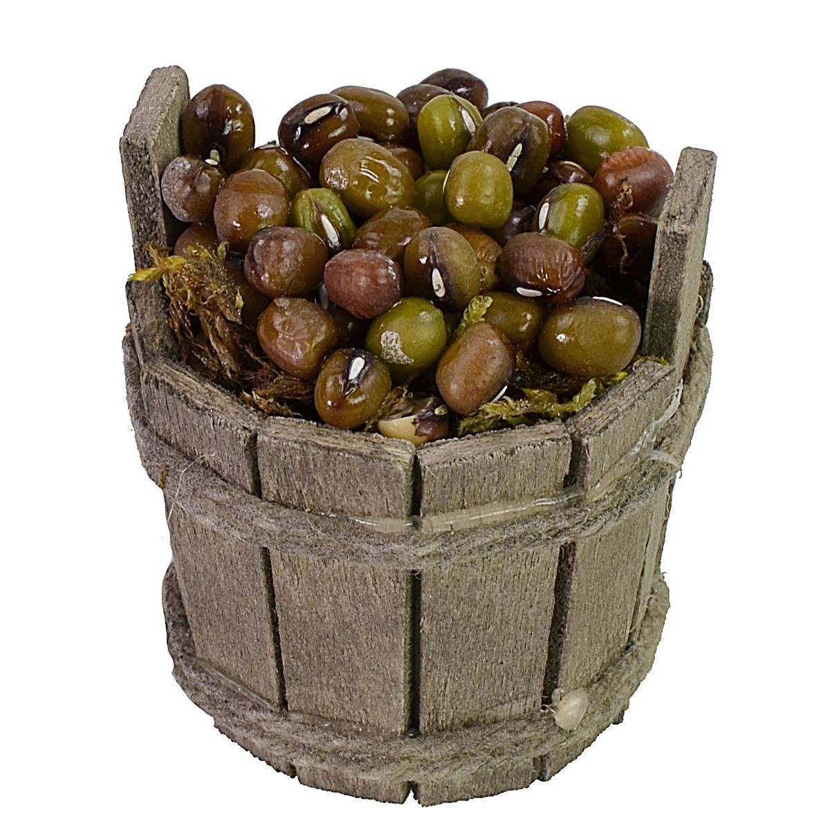Very realistic dark wooden tub with olives, miniature for nativity scene made entirely by hand, recommended for statues of 10-12 cm in height.