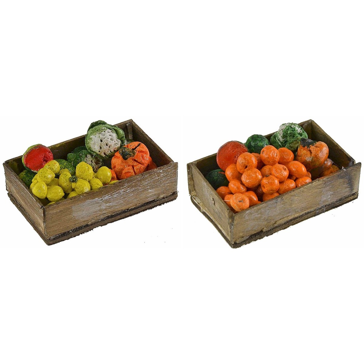 Cassetta realizzata artigianalmente in legno contenente frutta e verdura. L'accessorio in miniatura è utile per decorare il presepe fai da te ed è consigliato per statue di altezza da 20 a 24 cm.