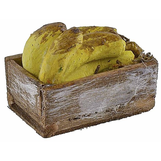 Cassetta realizzata artigianalmente in legno contenente delle banane. L'accessorio in miniatura è utile per decorare il presepe fai da te ed è consigliato per statue di altezza da 8 a 10 cm.