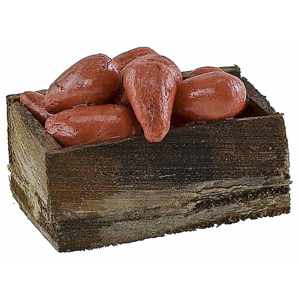 Cassetta realizzata artigianalmente in legno contenente delle pere. L'accessorio in miniatura è utile per decorare il presepe fai da te ed è consigliato per statue di altezza da 8 a 10 cm.