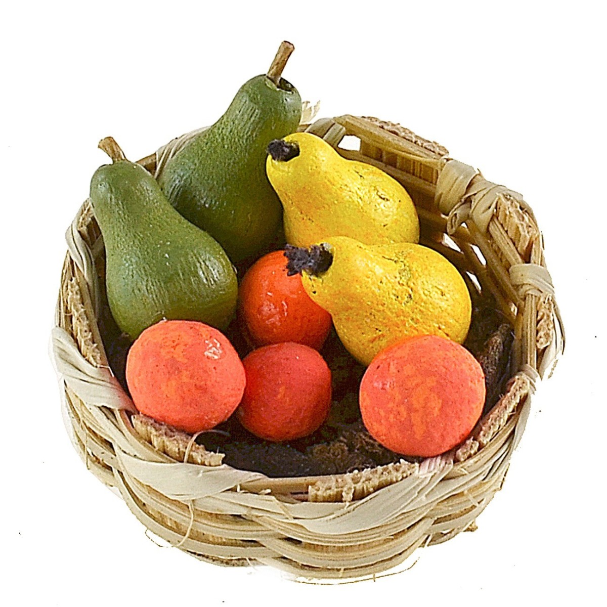 Cesto rotondo in vimini ricolmo di arance e pere. L'accessorio in miniatura è utile per decorare il presepe fai da te ed è consigliato per statue di altezza 12 cm.