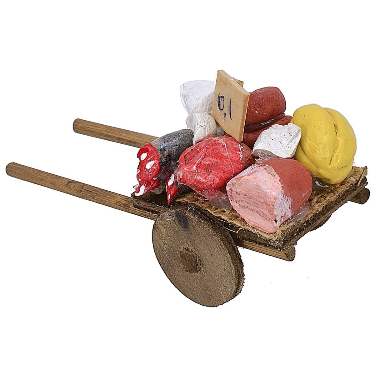 Carro in legno a due ruote con esposti salumi e formaggi. Questo articolo è molto originale, è stato realizzato da artigiani italiani ed è consigliato per statue di altezza 6-8 cm. Nella sezione MINUTERIE sono disponibili tanti accessori per personalizzare ed arricchire questo prodotto.