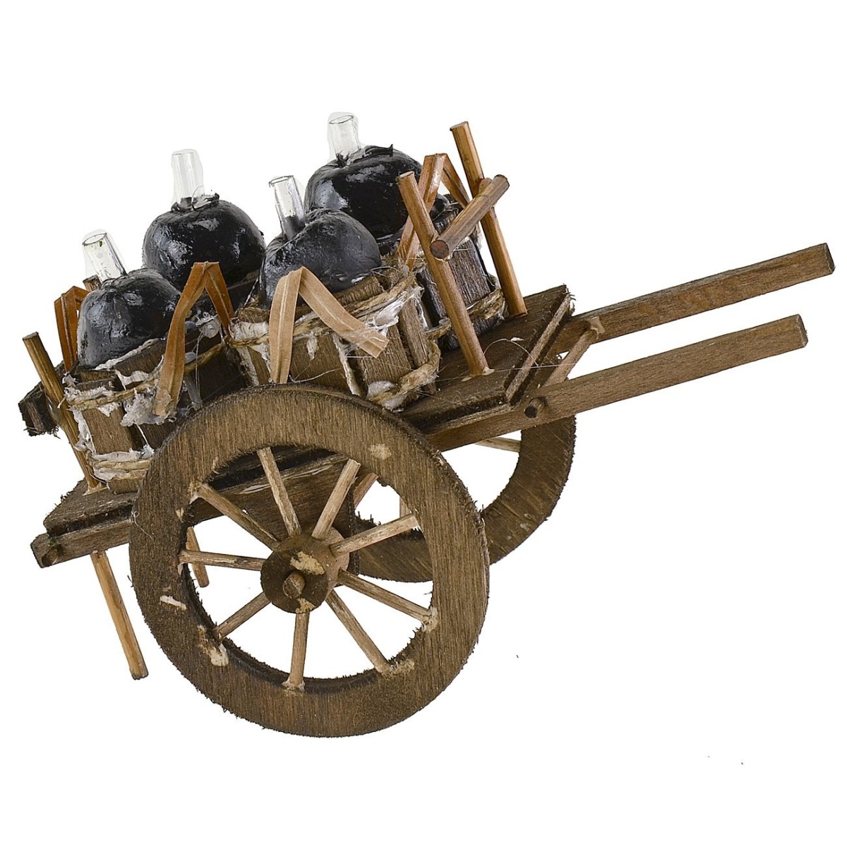 Wooden cart carrying 4 terracotta demijohns. The nativity scene product is recommended for figurines 10 cm high and was handcrafted in Italy.