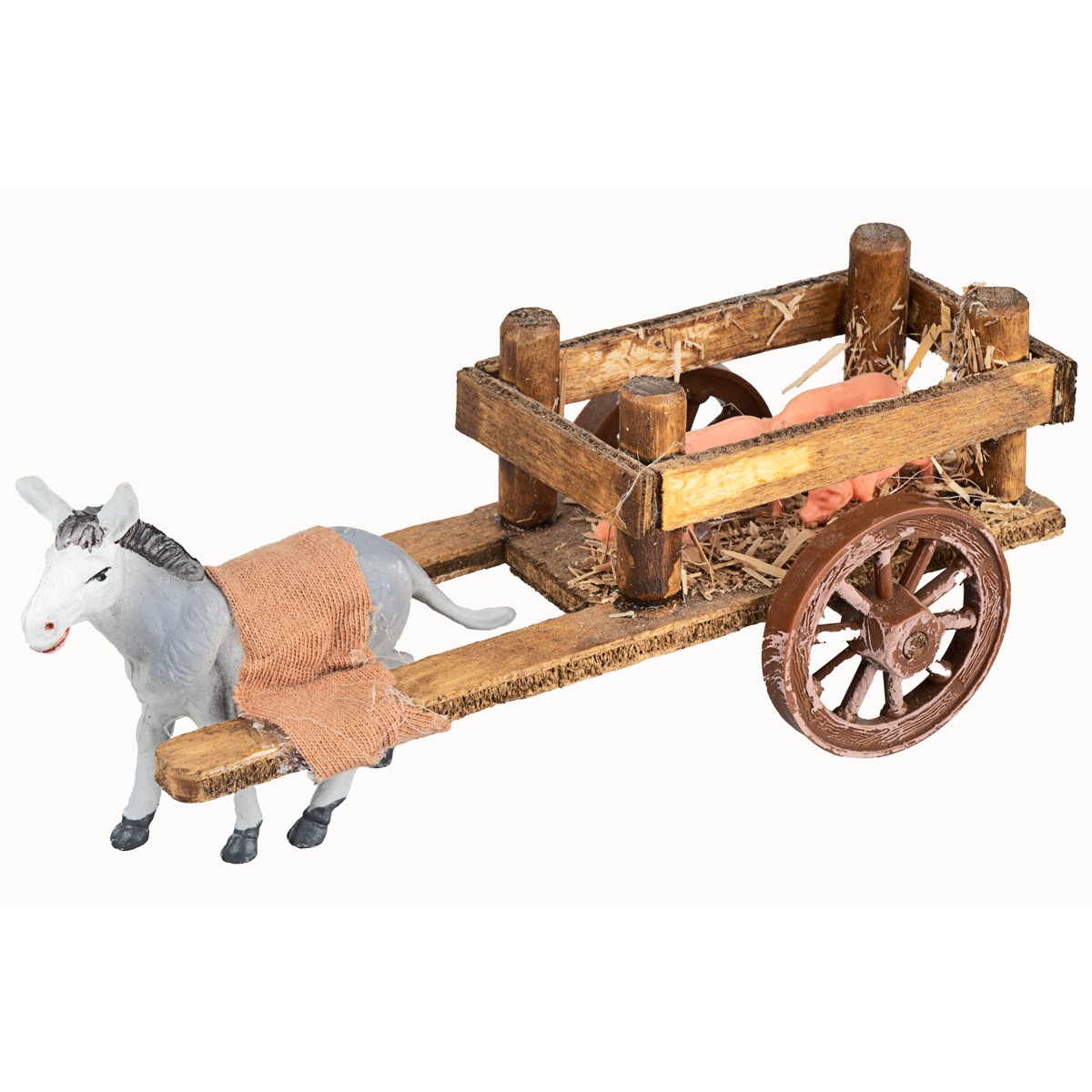 Beautiful handcrafted wooden cart with a load of pigs pulled by a donkey.