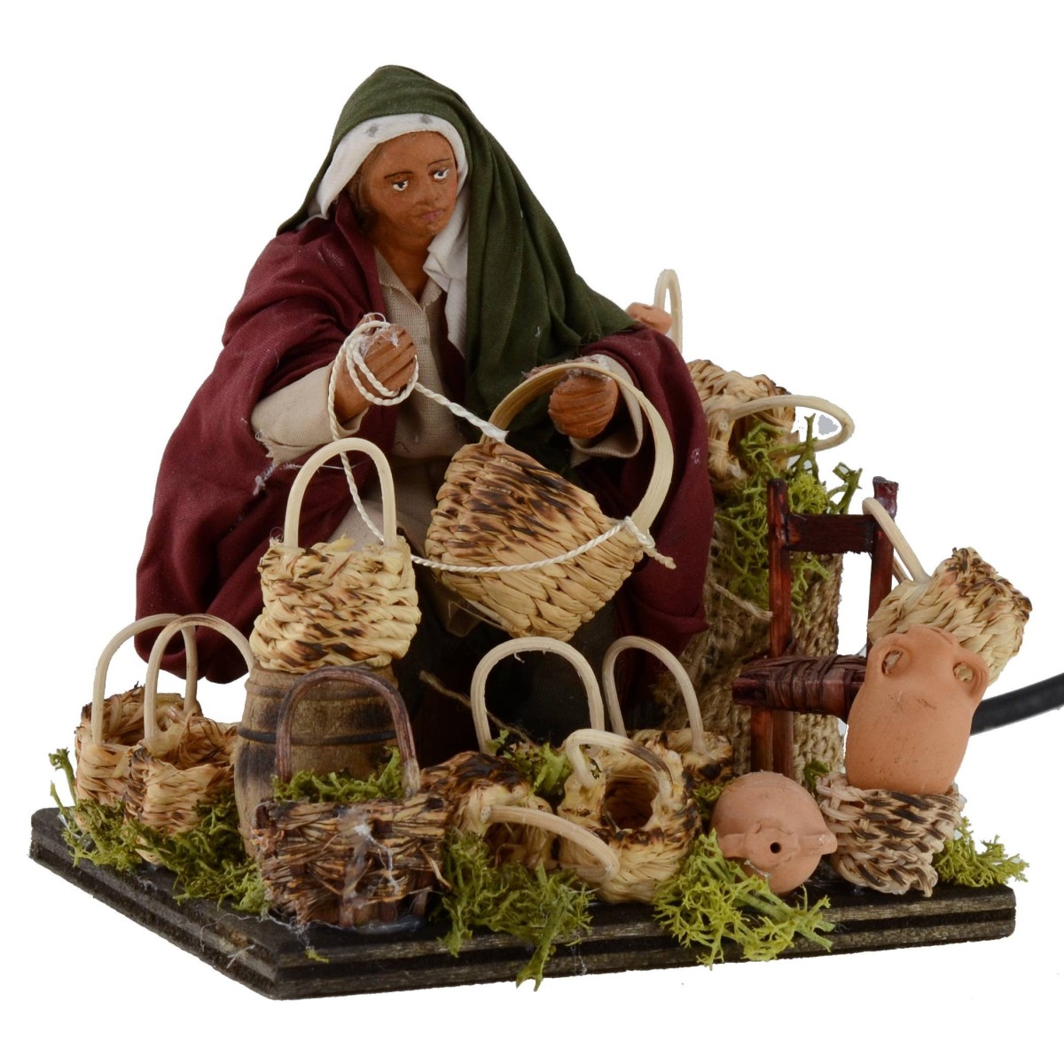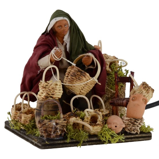 Repairman of cesti in motion. The scene is very rich in detail : in the foreground we see the man, seated, who thanks to the movement of the arm, simulates the action of fixing a basket in vimines. All around, beamed on the ground, we notice the presence of multiple baskets. Other characteristic elements of the scene are the surrounding vegetation green, a few bumps, a chair and several amphorae. The statue is made in terracotta and painted by hand in Italy by savvy craftsmen with well-refinished fabric clothes. The statue for the Classic Presepe and / or Neapolitan measure, sitting, 10.5 cm and is characterized by the use of materials such as wood, cloth and terracotta ; it is part of the series of statues from 14 cm.