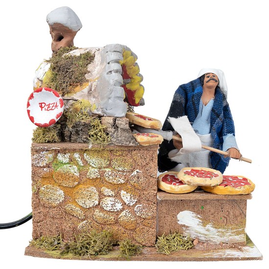 The scene depicts the craftsman next to the wood-fired oven: the figure moves arms and torso simulating the action of baking and preparing pizzas.