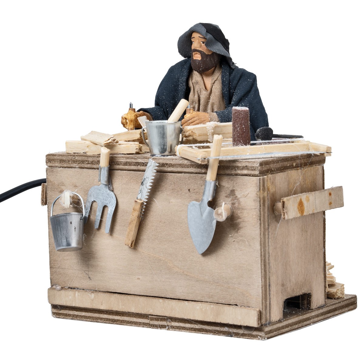 The scene depicts the craftsman moving his arms to simulate the action of cutting a piece of wood placed on the cutting machine of the bench, creating a realistic effect of the artisan work. The bench is enriched with tools and accessories such as saws, buckets, and various tools.