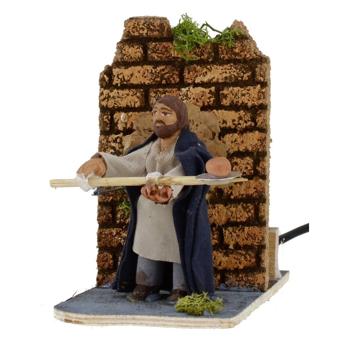 Panettiere in movimento che inforna il pane. Statua realizzata in terracotta e dipinta a mano in Italia da sapienti mani artigiane, l'articolo risulta ben rifinito con vestiti in tessuto. Statuina adatta al Presepe classico popolare di altezza 8cm.