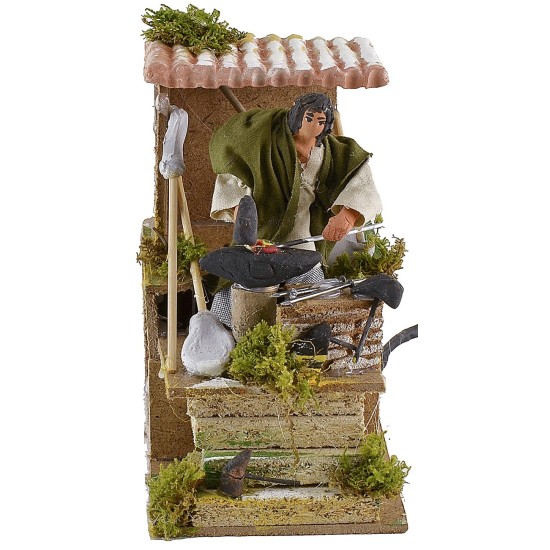 Fabbro in movimento che batte il ferro rovente sull'incudine. L'artigiano grazie al movimento su e giù del braccio simula la lavorazione del metallo Nell'ambientazione sono presenti ciuffetti di vegetazione. La statua per presepe è di terracotta con abiti in tessuto, i colori dei vestiti e del viso possono variare rispetto alla foto. L'articolo è funzionante a corrente ed è stato realizzato interamente a mano da artigiani italiani in legno, sughero, muschio e terracotta.