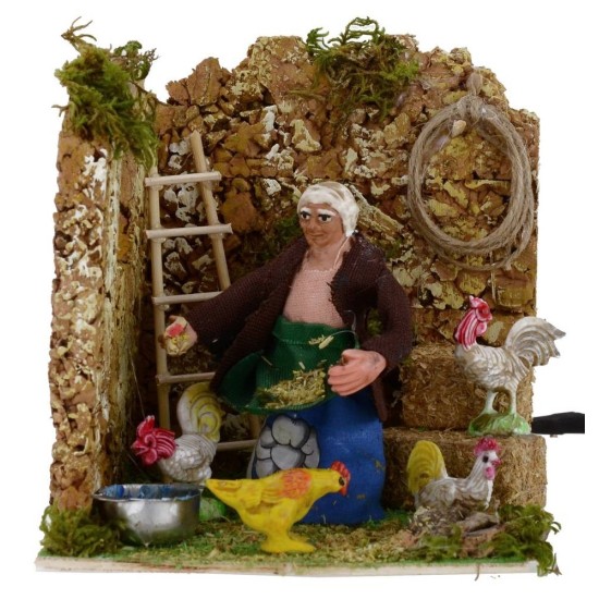 Contadina con galline in movimento. La scena è stata realizzata in Italia da sapienti mani artigiane, ben rifinita con la statua di terracotta vestita in tessuto di altezza 8 cm. Questa ambientazione è ricca di dettagli di tante minuterie come galline, la scala di legno, una corda appesa e le balle di fieno.