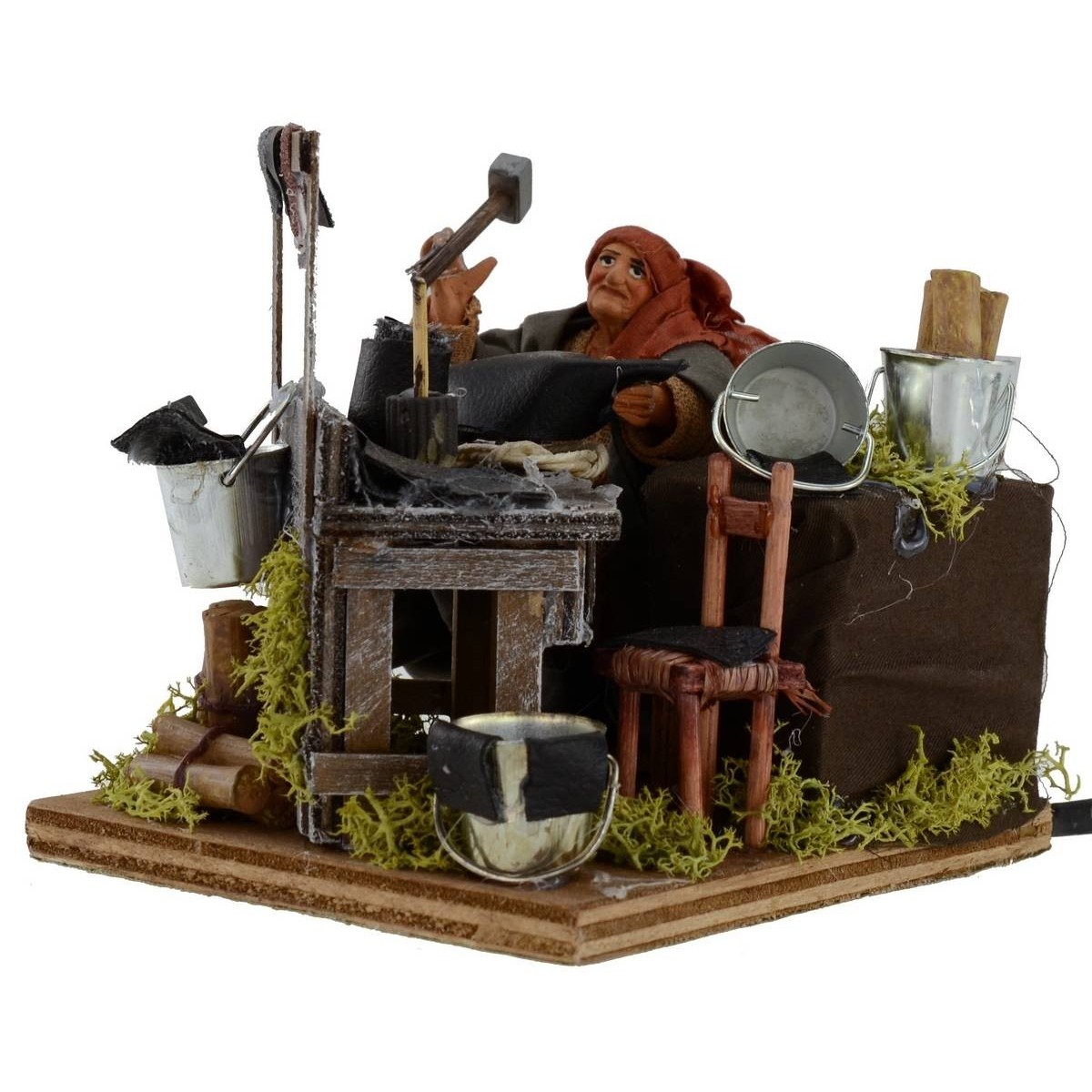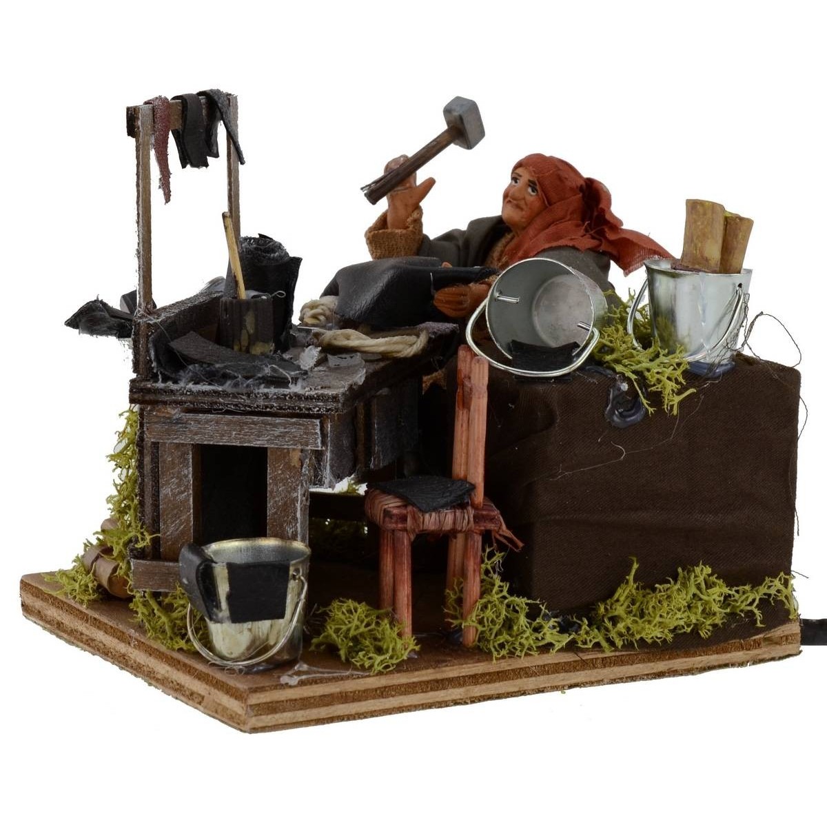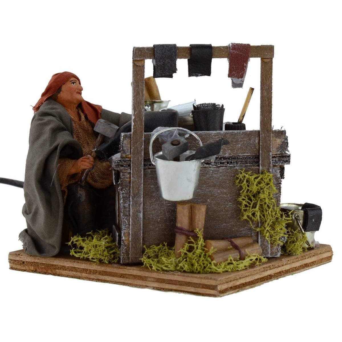 Ciabattino in motion. The scene is very rich in detail : in the foreground we see a workbench where the man, sitting, thanks to the movement of the arm, simulates the action of beating with the hammer for the creation of footwear. All around, comforted on the bench, we notice the presence of multiple tools from work and materials. Other characteristic elements of the scene are the surrounding vegetation green, a chair, various buckets and small wooden trunks. The statue is made in terracotta and painted by hand in Italy by savvy craftsmen with well-refinished fabric clothes. The statue for the Classic Presepe and / or Neapolitan measure, sitting, 9 cm and is characterized by the use of materials such as wood, cloth and terracotta ; it is part of the series of statues from 12 cm.