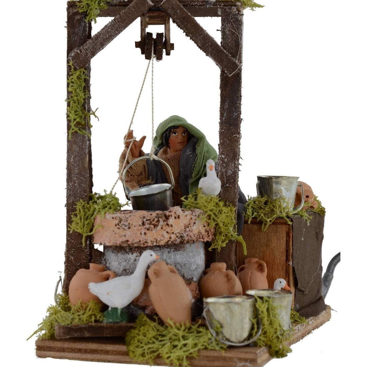 Woman at the well in motion. The scene is very rich in detail : in the foreground we see the woman, intent on calving and a bucket inside the well. Thanks to the movement of his arm, which lowers and rises, the woman simulates the action of calving the bucket inside the well and collecting water. All around, on the ground, we notice the presence of multiple terracotta amphoras, several secluded buckets and the company of three geese. Other characteristic elements of the scene are the surrounding vegetation green. The statue is made in terracotta and painted by hand in Italy by savvy craftsmen with well-refinished fabric clothes. The statue for the Classic Presepe and / or Neapolitan measures 9 cm and is characterized by the use of materials such as wood, cloth and terracotta ; it is part of the series of statues from 10 cm.