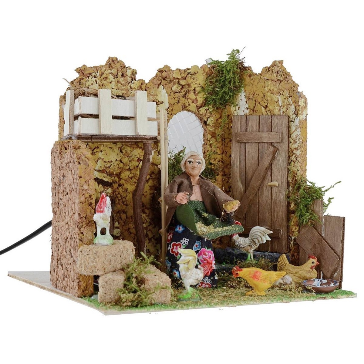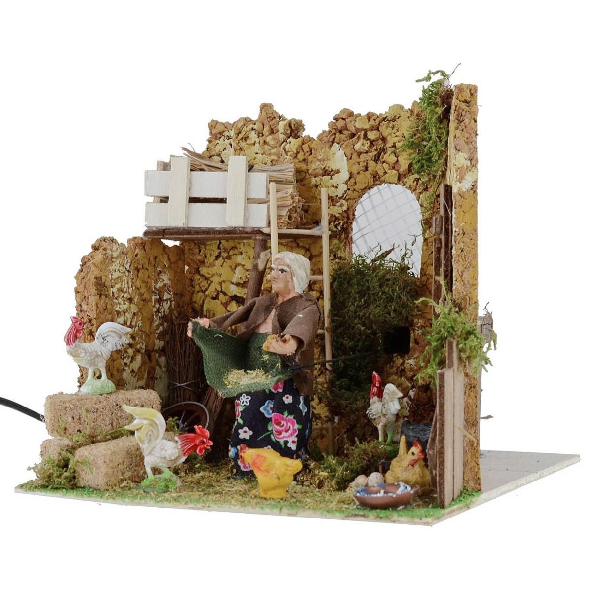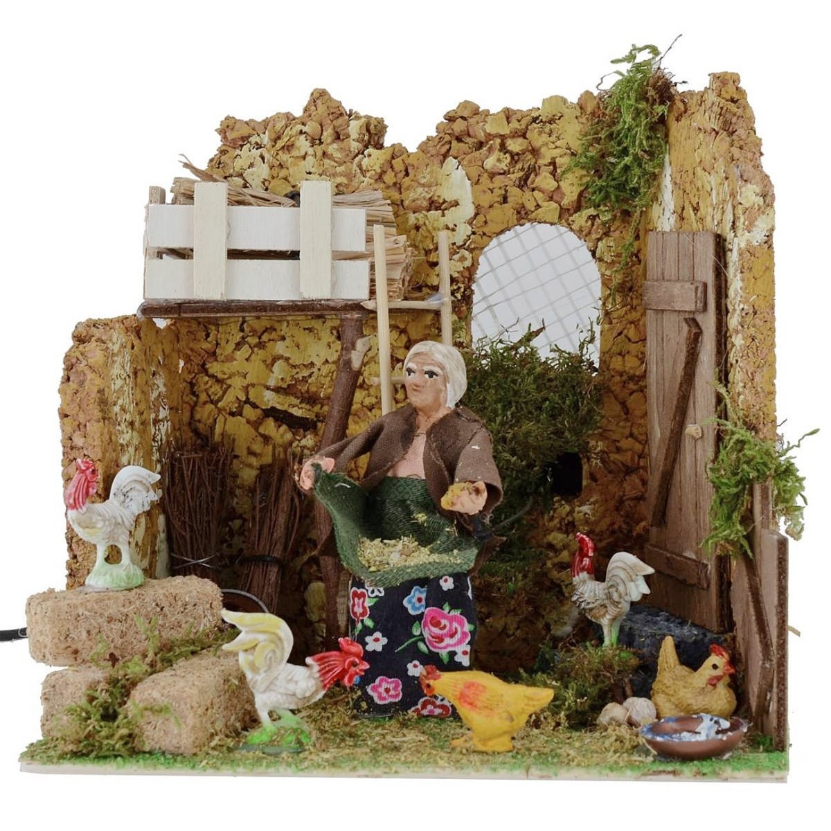 Farmer who peels the chickens in motion, functioning at current. The scene is rich in detail : in the foreground we see the woman, intending to buck the hens thanks to the movement of her bust, which she waves to the right and left, simulating precisely the action of adacting the food all around. The scenography is set in a henhouse, which is characterized by the presence of numerous hens, eggs, straw beams and wood, a wheel and a ladder. Other characteristic elements of the scene are the surrounding vegetation green. The scene is delineated by three walls in cork-like stone effect. The statue is made in terracotta and hand-painted in Italy by artisan hands with woven clothes. The statue for the Classic Presepe and / or Neapolitan measures 9 cm and is characterized by the use of materials such as wood, cloth and terracotta and cork ; it is part of the series of statues from 10 cm.