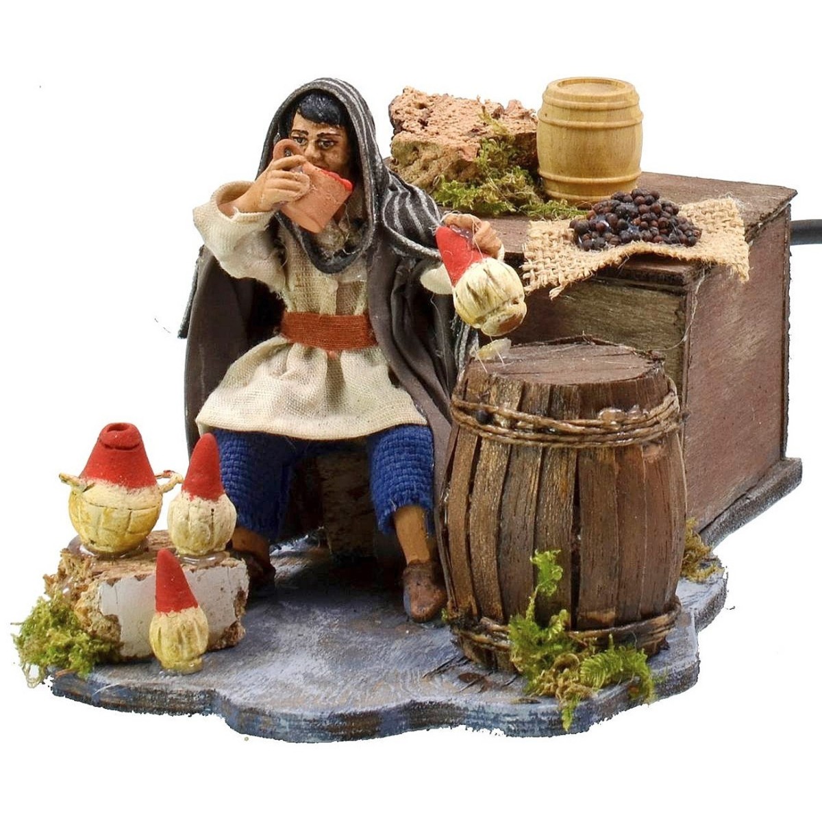 Beone sitting in motion, running on electricity. The scene is rich in detail: in the foreground we see the man, seated, intent on drinking from his glass. Around the character, lying on the ground, we notice several flasks of red wine and a large barrel. In the background, however, we see a harvest of grapes on a placemat and a small barrel. The following small parts are treated in detail. The statue is made of terracotta and hand painted in Italy by artisan hands with fabric clothes and is equipped with a mains plug. The statue for the classic and / or Neapolitan crib measures, seat, 9.5 cm and is characterized by the use of materials such as wood, cork, fabric and terracotta; it is part of the series of 12 cm statues.