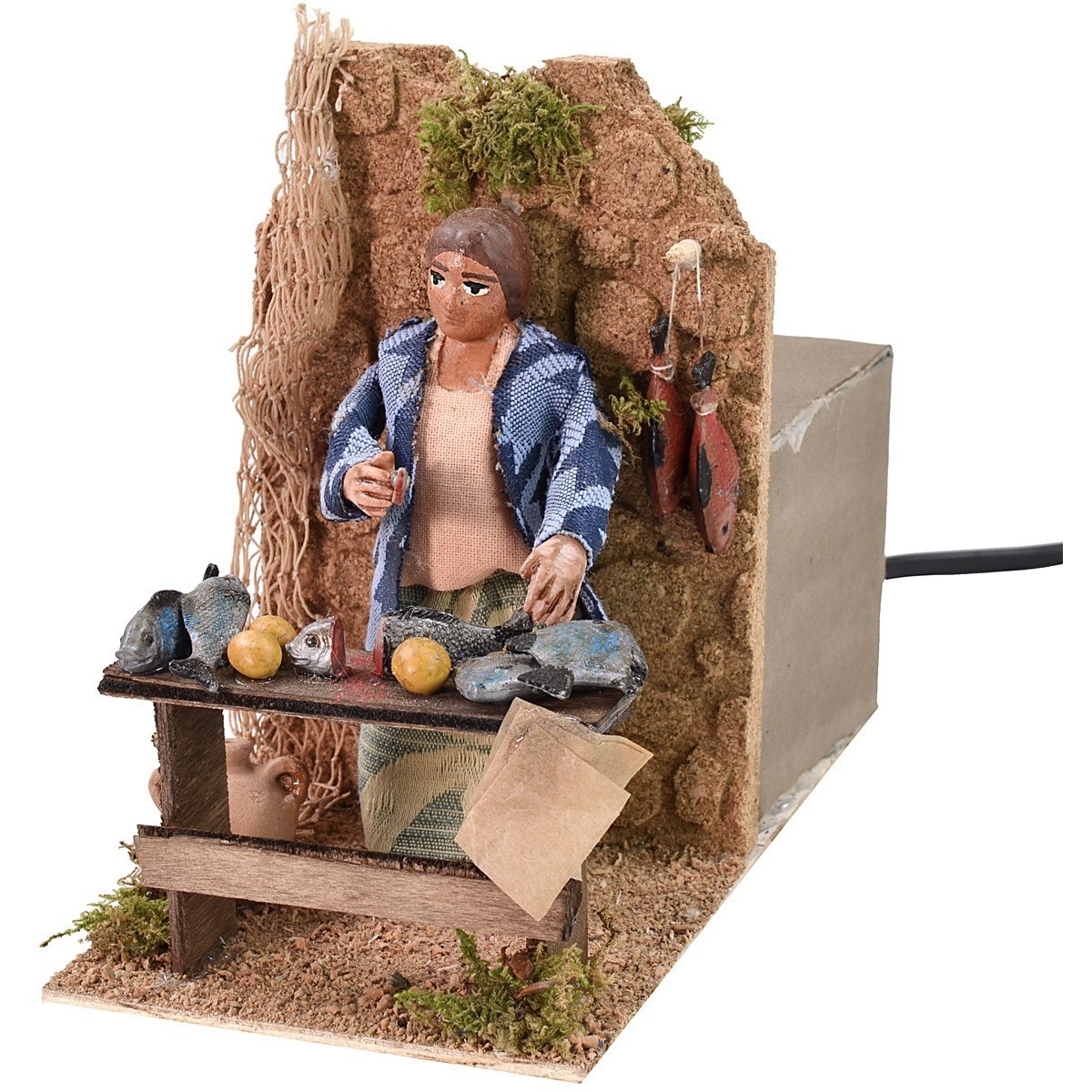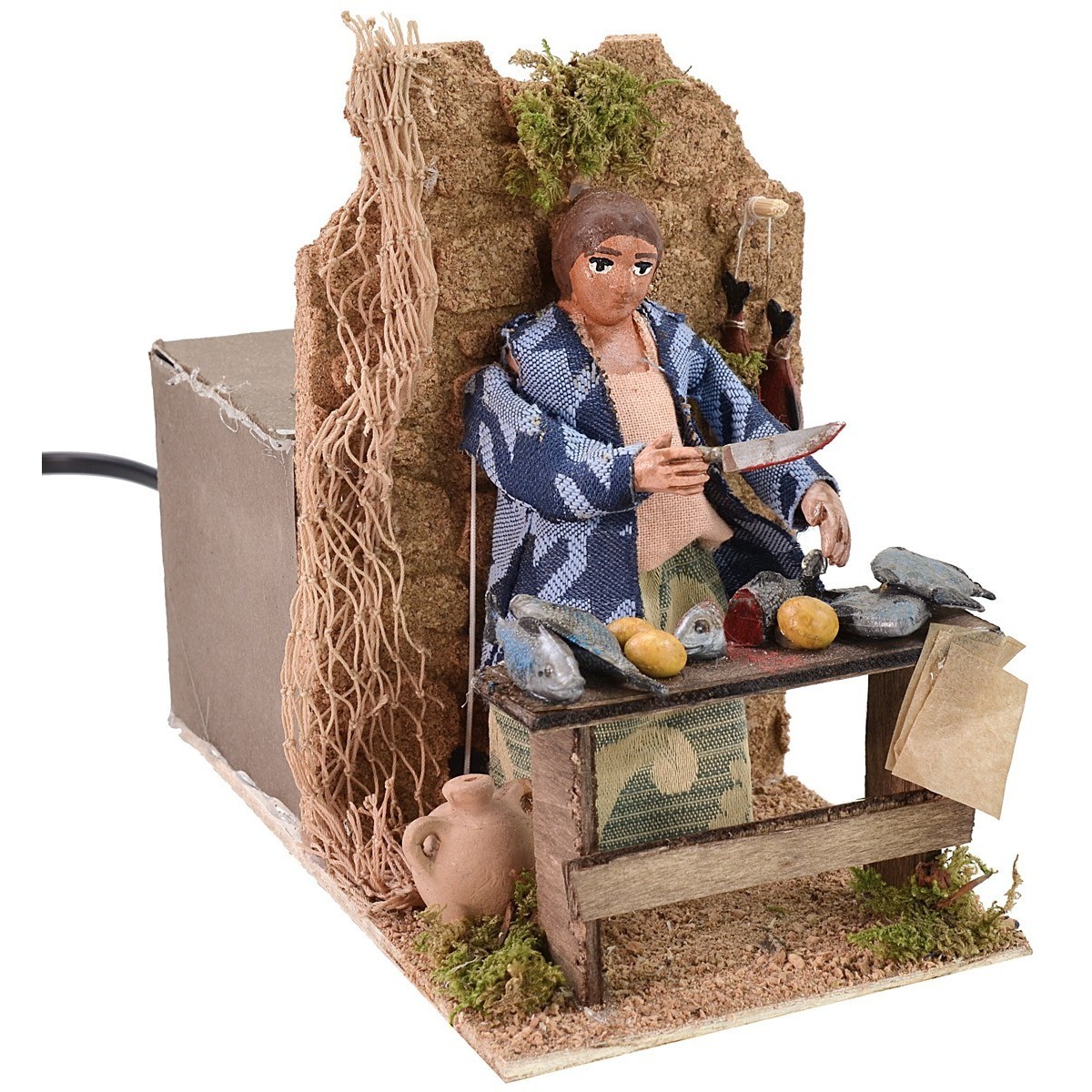 Pescivendola in stile napoletano 10 cm in movimento, alza e abbassa il braccio con cui impugna il coltello per tagliare il pesce sul bancone.  La scena è ben rifinita con tanti pesci, carta per incartare e del muschio. La statua presenta un viso di terracotta molto espressivo ed è accuratamente vestita con abiti in tessuto, ogni pezzo è realizzato interamente a mano da artigiani italiani pertanto i colori e gli abiti potrebbero variare. L'articolo è funzionante a corrente.