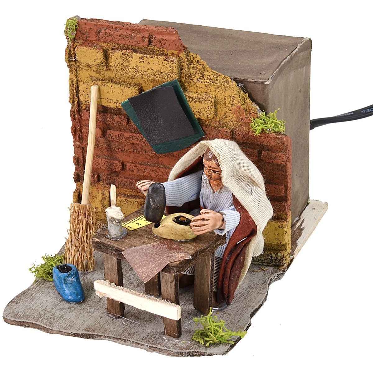 Ciabattino serie 8 cm in movimento, muove il braccio con cui impugna il martello che usa per battere sulla scarpa; la scena è arricchita da altri attrezzi da lavoro. La statua presenta un viso di terracotta molto espressivo ed è accuratamente vestita con abiti in tessuto, ogni pezzo è realizzato interamente a mano da artigiani italiani pertanto i colori e gli abiti potrebbero variare. L'articolo è funzionante a corrente.
