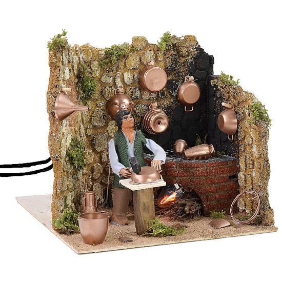 Coppersmith in motion who beats with a hammer on a copper pan to work it, made of terracotta by skilled Italian artisan hands, presents an oven with fire effect running on current that helps to make the scene alive. The scene is treated in detail, the environment is rich in details such as the copper objects already worked, the pieces discarded on the ground on the floor, the black smoke stain on the wall behind the oven, the tree branches used as a source. energy.