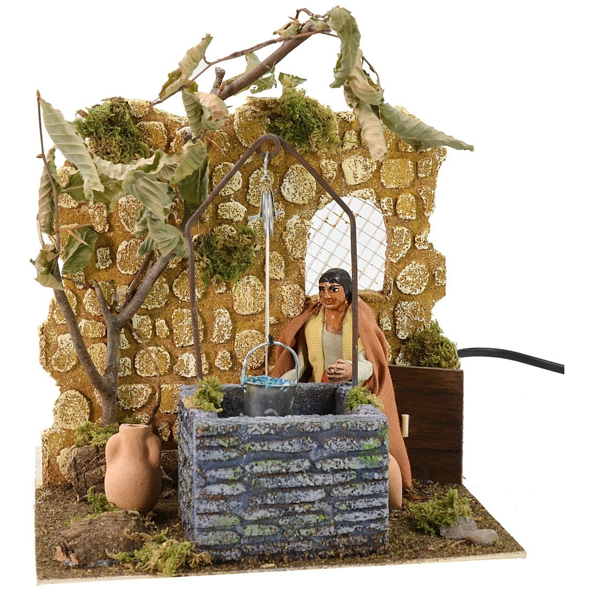 Donna in movimento che alza e abbassa il braccio in cui tiene il filo del secchio che usa per prendere l'acqua dal pozzo, realizzato in terracotta da sapienti mani artigiane italiane. La scena è curata nei minimi dettagli, l'ambiente è ricco di particolari quali le due anfore per portare l'acqua a casa, il coperchio del pozzo che la donna ha posato a terra ai suoi piedi, la carrucola che fa scorrere il filo del secchio, l'albero reale sullo sfondo della scena.