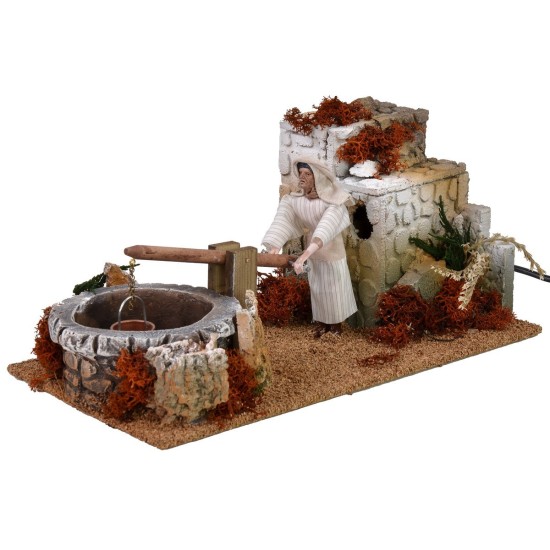 Palestinian man at the well cm 12 who moves his torso to put pressure on the handlebar of the wooden lever that lifts the copper bucket from the well. The scene is finished down to the last detail with greenery adding color. The statue has a very expressive terracotta face and is carefully dressed in fabric clothes, each piece is made entirely by hand by Italian artisans therefore the colors and clothes may vary. The article is working on electricity.
