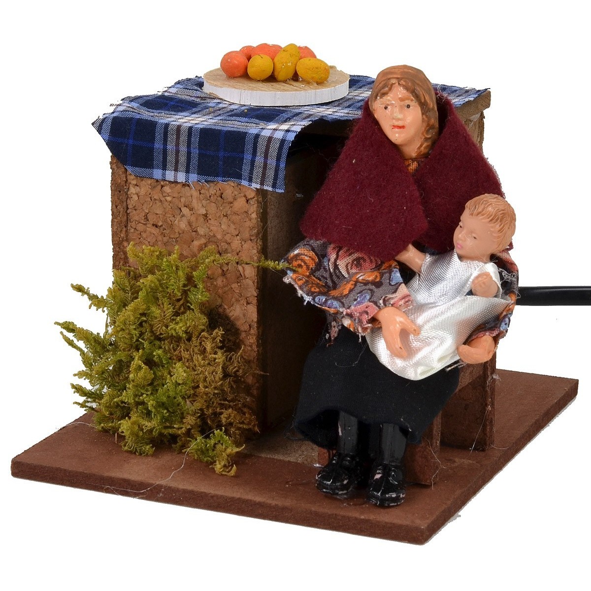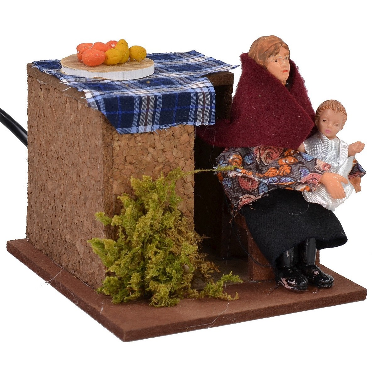 Donna seduta in movimento che culla il bimbo che tiene tra le braccia. Scena per Presepe realizzata artigianalmente in Italia, ben rifinita nei dettagli con la statua vestita con abiti in tessuto ed un volto molto espressivo; il tutto è arricchito da una tovaglia con un tagliere colmo di frutta. L'articolo è funzionante a corrente.