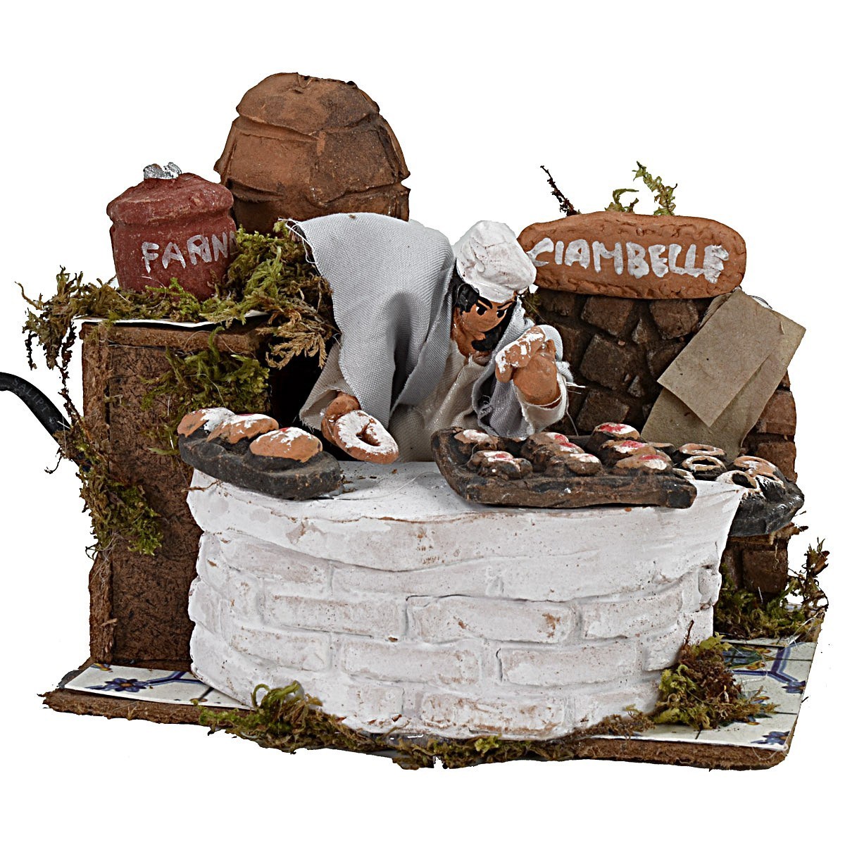 Scenografia per Presepe rappresentante una donna intenta a preparare delle ciambelle. Sul bancone bianco di fronte alla ciambellaia sono presenti dei prodotti da forno. La statua è realizzata in terracotta e dipinta a mano in Italia da mani artigiane con abiti in tessuto ed è dotata di una spina funzionante a corrente. La statua per il Presepe classico e/o napoletano misura 9 cm ed è caratterizzata dall'uso di materiali come il legno, il sughero, la stoffa e la terracotta.