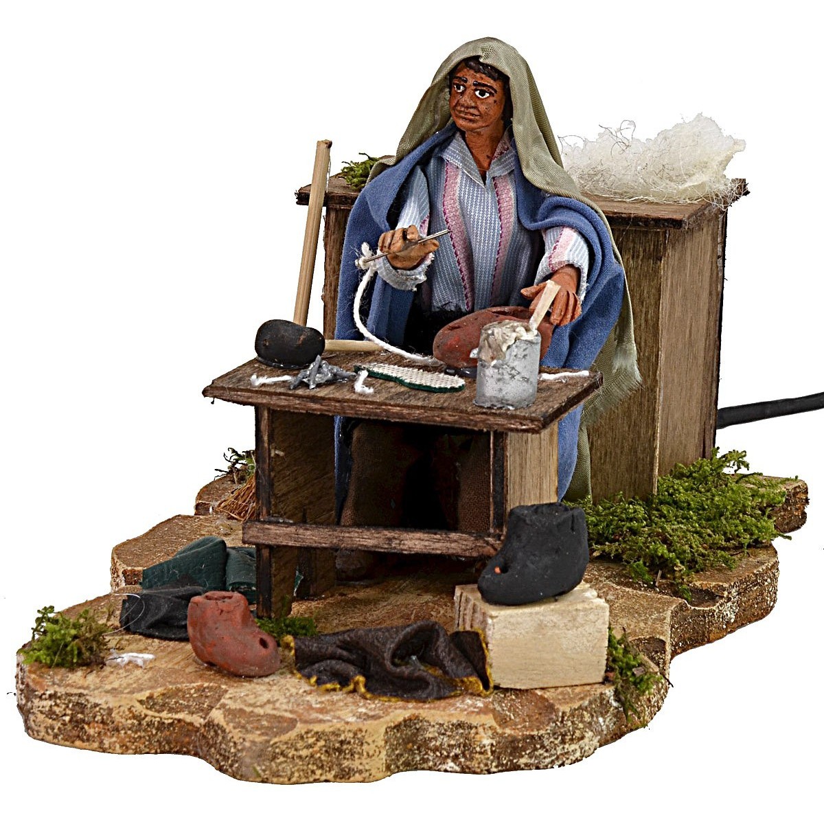 La scenografia rappresenta un ciabattino mentre rammenda delle scarpe della serie da 8 cm funzionante a corrente, realizzato in terracotta dipinta a mano e vestito con abiti in stoffa. La statua per Presepe è realizzata in Italia da sapienti mani artigiane e risulta ben rifinita nei dettagli: il personaggio presenta un viso molto espressivo. Ottimo prodotto per rendere unico ed originale il vostro Presepe.