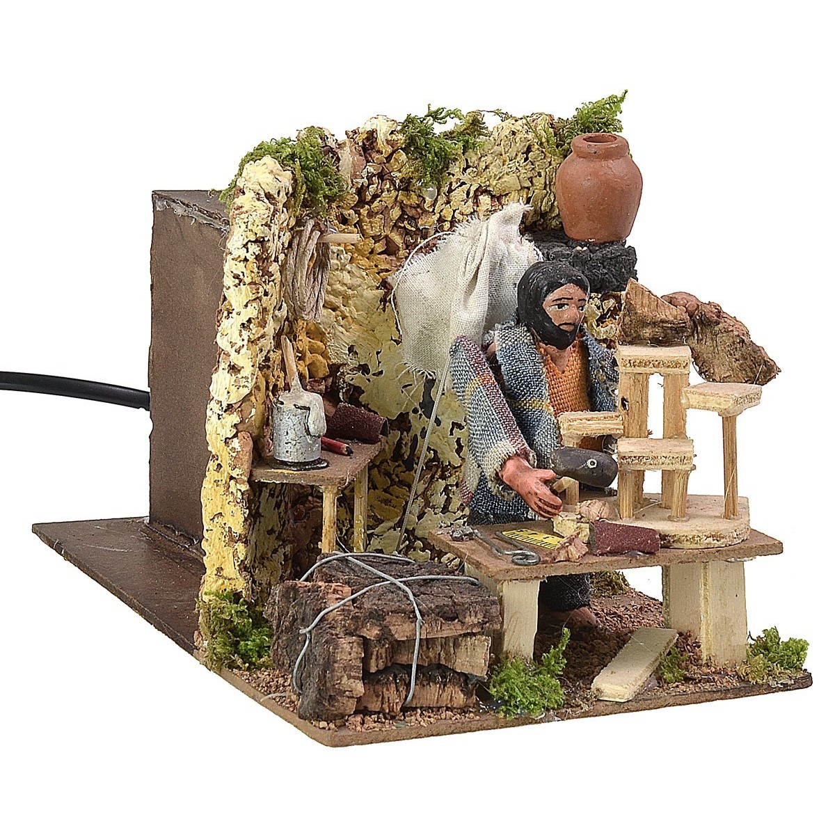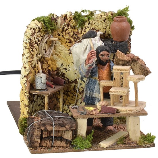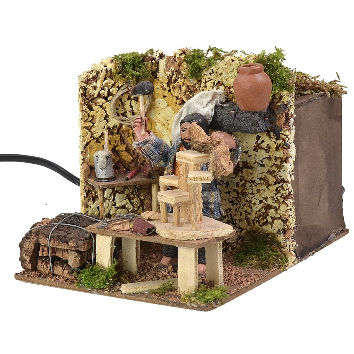 Presepista in movimento che alza e abbassa il braccio con cui impugna il martello che sta utilizzando per preparare la struttura in legno che sorreggerà la sua opera. L'ambientazione è minuziosa rifinita da tanti oggetti da lavoro e minuterie, oltre che una catasta di pezzi di sughero. La statua fa parte della serie 8 cm in resina ed è di fattura artigianale italiana, il meccanismo è funzionante a corrente.