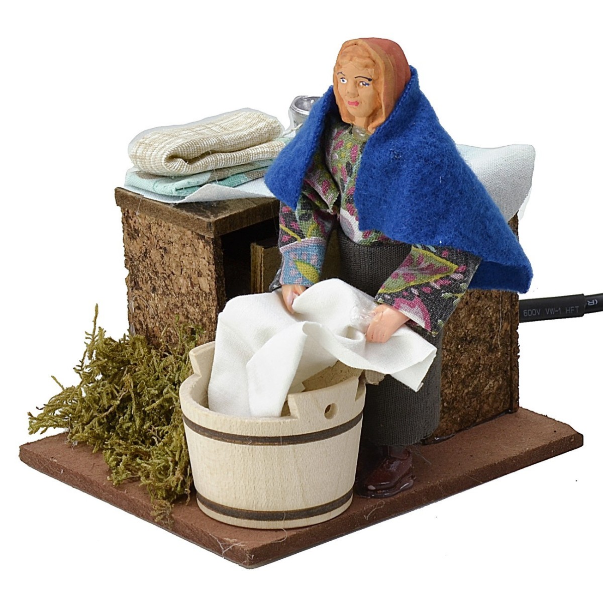 Moving washerwoman reproducing the action of washing clothes in a wooden tub. Nativity scene handcrafted in Italy, well finished in detail with the statue dressed in fabric clothes and a very expressive face; the whole is enriched by musk and folded linen next to it. The article is working on electricity