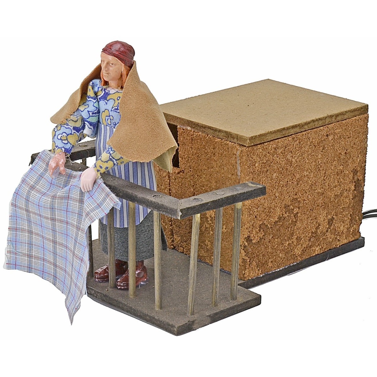 Woman on the balcony in motion flapping clothes. Nativity scene handcrafted in Italy, well finished in detail with the statue dressed in fabric clothes and a very expressive face; the balcony will be anchored to a house. The article is working on electricity.