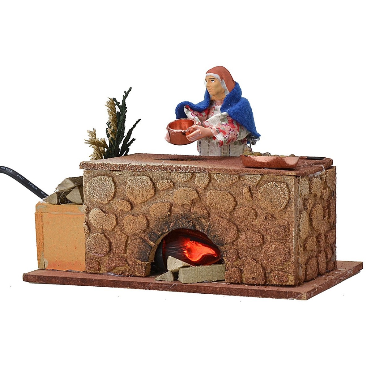 A woman cooking, raises and lowers the pan in her hands from the stove. Nativity scene handcrafted in Italy, well finished in detail with the statue dressed in fabric clothes and a very expressive face; everything is enriched by a cork oven, wood and pots. The article is working on electricity.