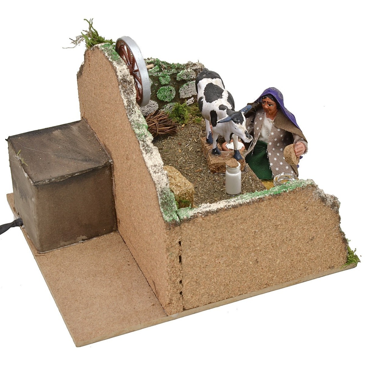 Contadina seduta serie 10 cm in movimento che con la mano destra munge la mucca. L'ambientazione è realizzata in legno, sughero con pareti di pietre, arricchita con balle di paglia, fascina di legna e bidone del latte . La statua è realizzata in terracotta vestita con abiti in tessuto prodotta da artigiani Italiani. L'articolo è funzionante a corrente.