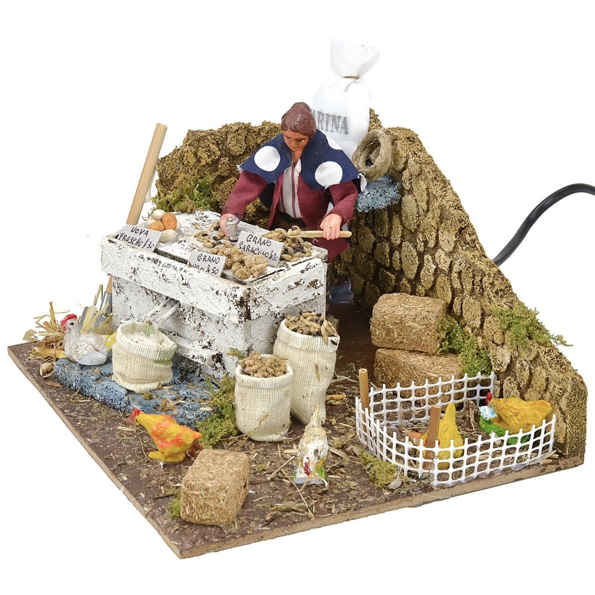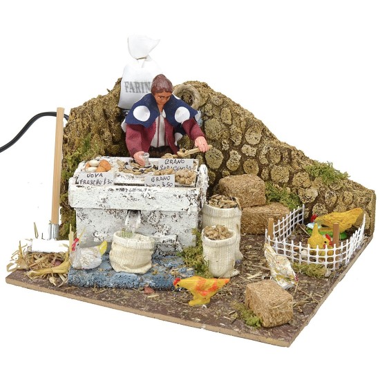 Mugnaia 10 cm in movimento che con una mano gira la ruota mentre con l'altra carica la macina. L'ambientazione è realizzata in legno, sughero e rifinita minuziosamente con attrezzi da lavoro e minuterie, oltre che da elementi naturali e animali, come galline nel recinto. La statua è realizzata in terracotta vestita con abiti in tessuto prodotta da artigiani Italiani. L'articolo è funzionante a corrente.