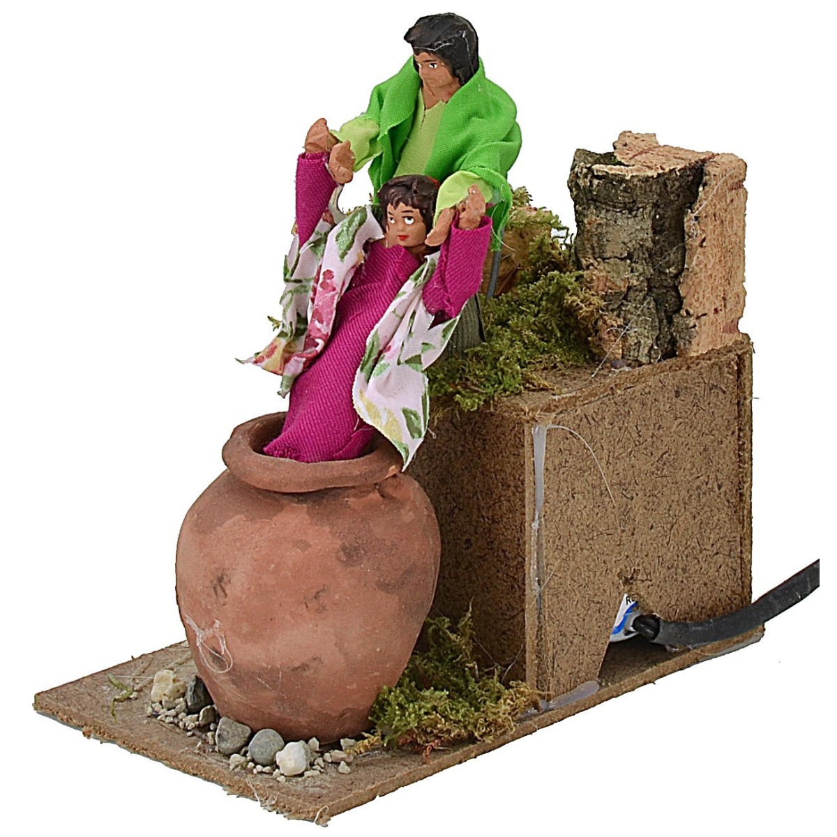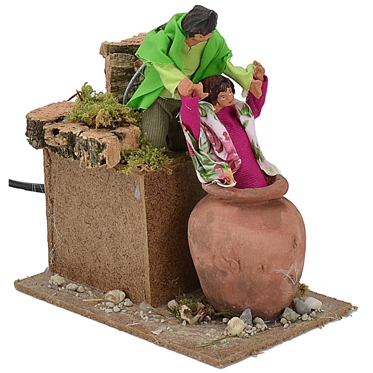 Coppia di bambini in movimento che giocano. Entrambe le figure si muovono: in particolare, il bambino, solleva e abbassa la bambina all'interno dell'anfora sottostante. one sono presenti ciuffetti di vegetazione, un banchetto con anfore e piatti in terracotta colmi di miele ed un vaso di fiori. Le statue sono di terracotta con abiti in tessuto, i colori dei vestiti e del viso possono variare rispetto alla foto. Prodotto realizzato interamente a mano da artigiani italiani in legno sughero, muschio e terracotta. L'articolo è funzionante a corrente.
