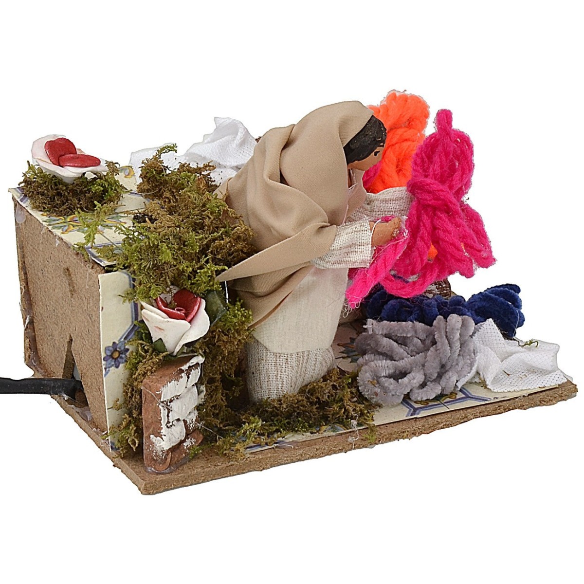 Venditrice di gomitoli in lana con movimento, la commerciante muove il busto simulando un invito alla clientela ad acquistare. La statua è di terracotta con abiti in tessuto, i colori dei vestiti e del viso possono variare rispetto alla foto. Prodotto realizzato interamente a mano da artigiani italiani in legno sughero, muschio e terracotta. Il prodotto è funzionante a corrente.