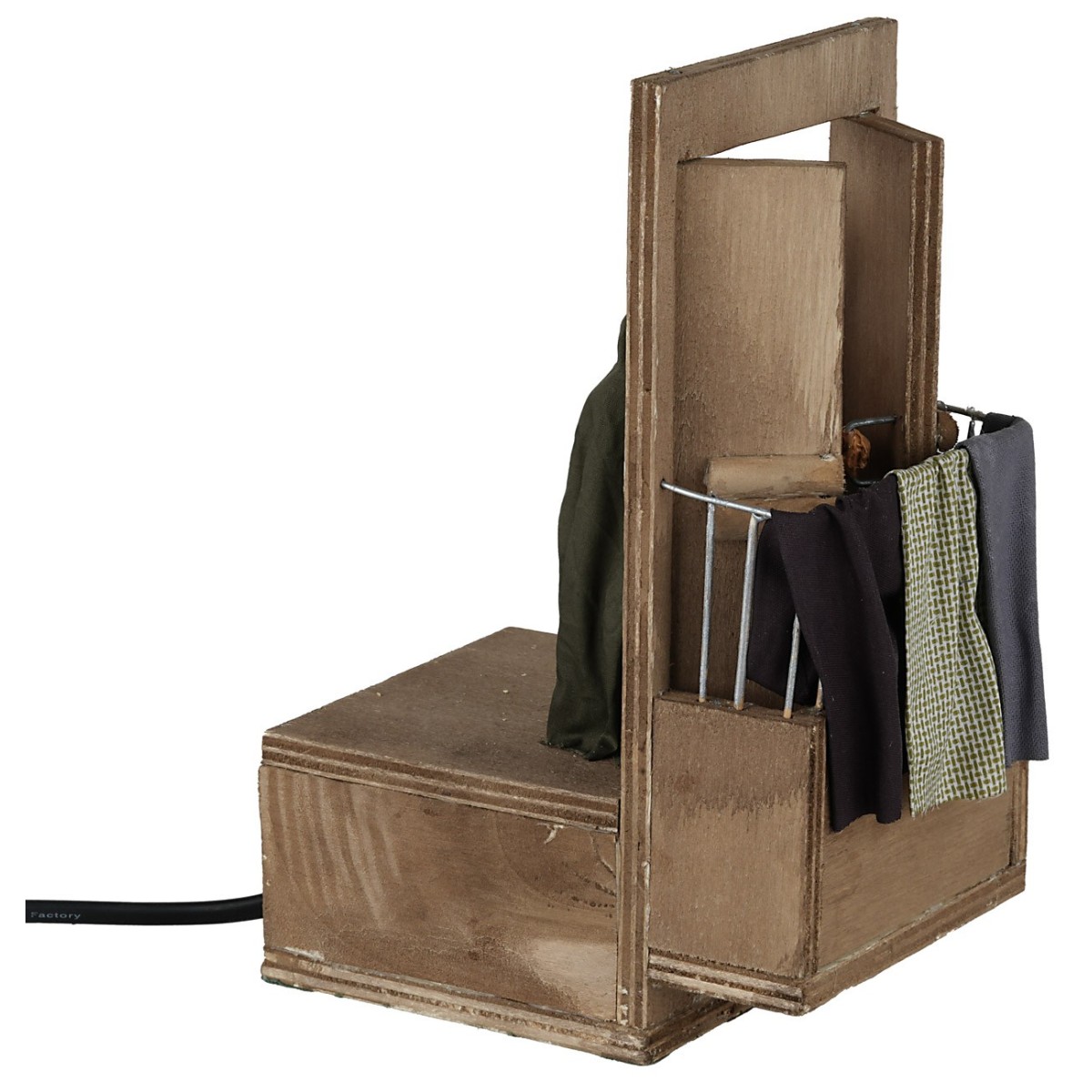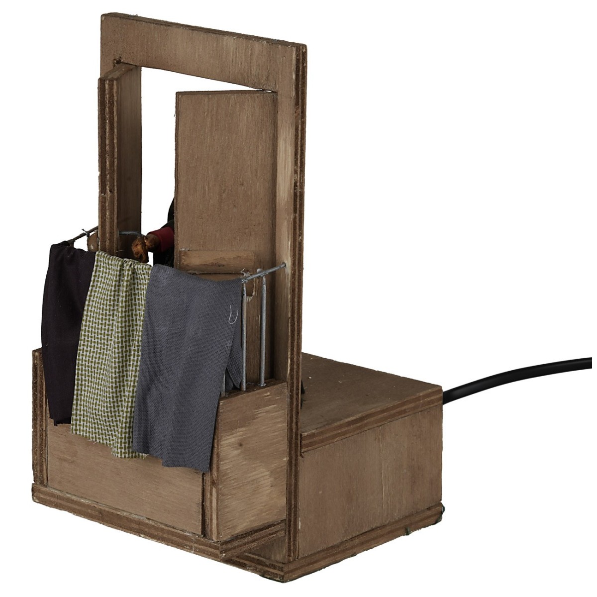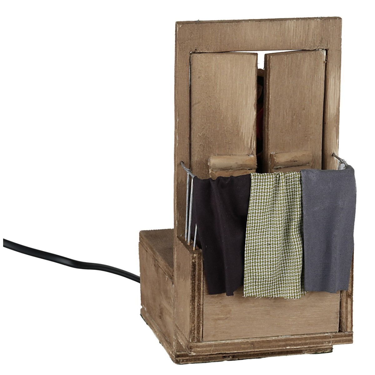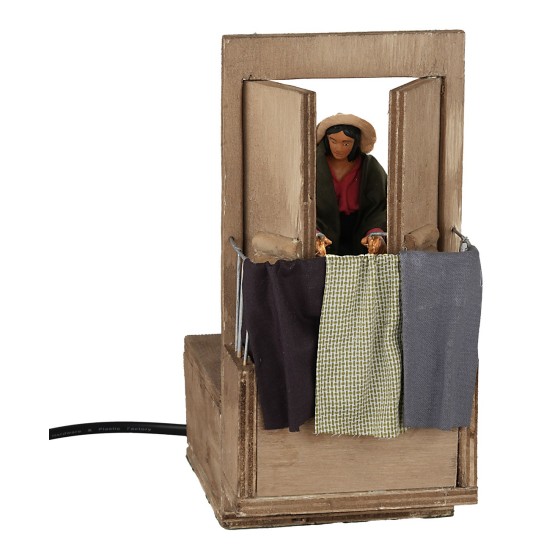 Woman opening the door to step onto the balcony with arm movements. The figurine is made of terracotta and hand-painted in Italy by skilled artisans, with well-finished fabric clothing. This figure is ideal for placement in the context of a home within a classic or Neapolitan Nativity scene and is electrically powered. Please note that product details may vary as it is handcrafted.