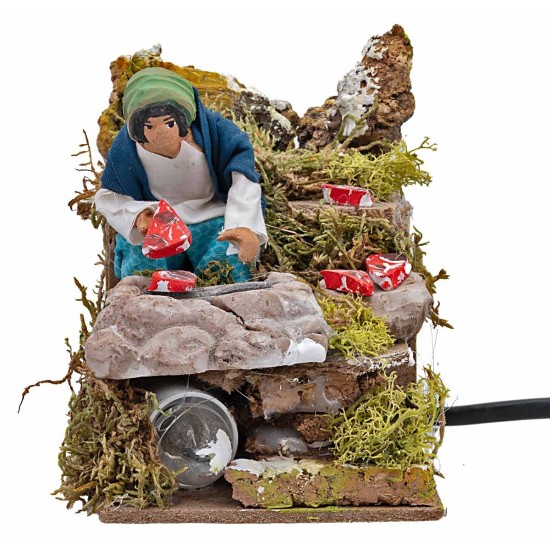 Man who, with the movement of his torso, simulates the action of cooking steaks on the barbecue, equipped with a light with working fire effect. Made of terracotta and hand-painted by Italian artisans, it is dressed in fabric clothing. Ideal for a classic or Neapolitan nativity scene, the figure operates on electricity. The scenery accompanying it is constructed with wood, cork, moss, and terracotta, creating a traditional and evocative environment. It should be noted that some product details, like the face and color of the clothes, may vary, ensuring the uniqueness of each piece, as it is entirely handmade.