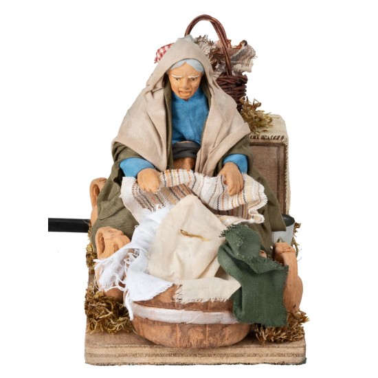 Kneeling laundress in motion. The woman is kneeling and holding a striped cloth in her hands, performing an up-and-down motion to simulate washing the cloth. Below her, there is a large basket containing other cloths, and the scene is enriched with decorations such as a wicker basket behind her, small amphoras, and buckets. The scenery, made with wood, cork, moss, and terracotta, creates a traditional and evocative environment. Please note that product details may vary, ensuring the uniqueness of each piece as it is handmade.