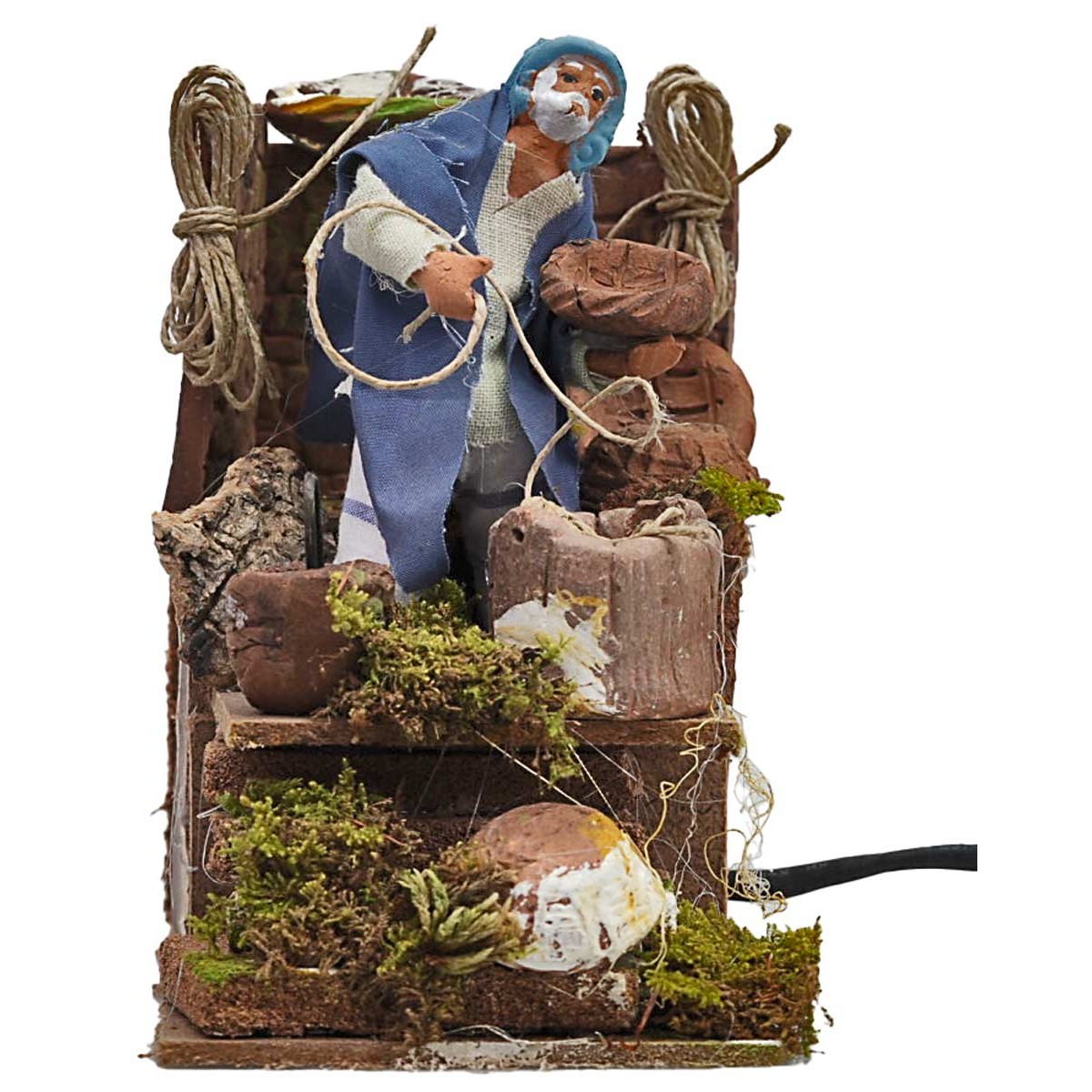 Moving terracotta basket weaver 10 cm. The man stands on a wooden structure surrounded by baskets and small baskets, the torso goes up and down, and he has a rope tied to his hand that consequently extends. The statue is made of terracotta and hand-painted in Italy in an artisanal manner with fabric clothing. The statue for the classic and/or Neapolitan nativity scene is characterized by the use of materials such as wood, fabric, and terracotta, and is powered by electricity. Please note that the details of the product may vary as it is entirely handmade.