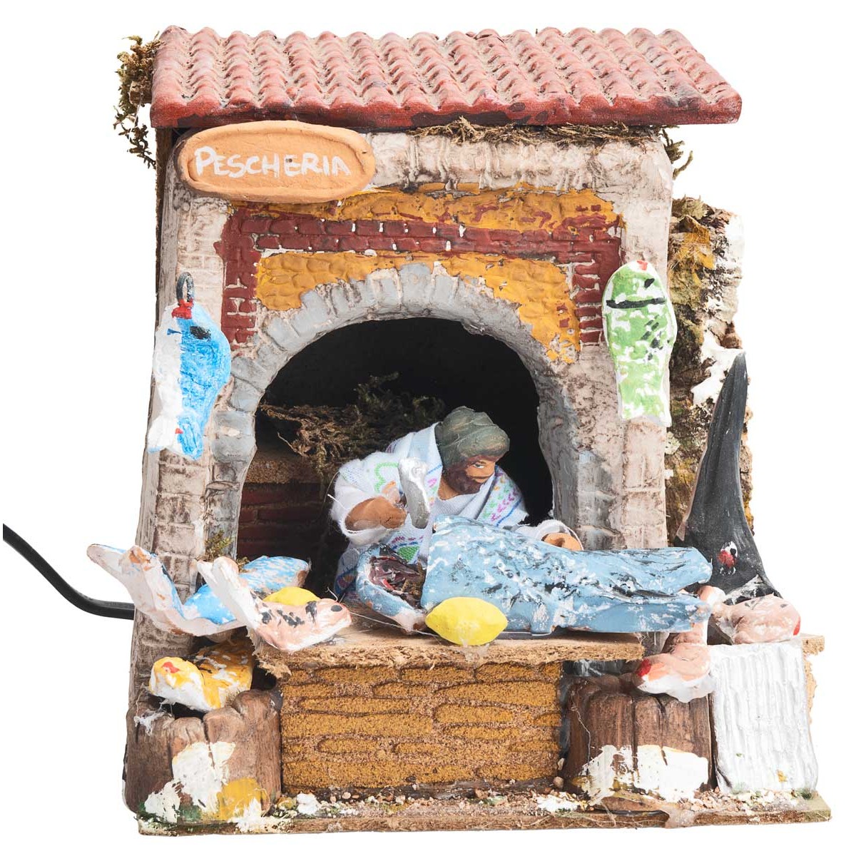 The scene depicts the artisan inside the fish shop: the character moves his right arm holding a small cleaver, simulating the cutting and preparation of the fish on the counter, while an internal light illuminates the shop, faithfully recreating the ancient craft.