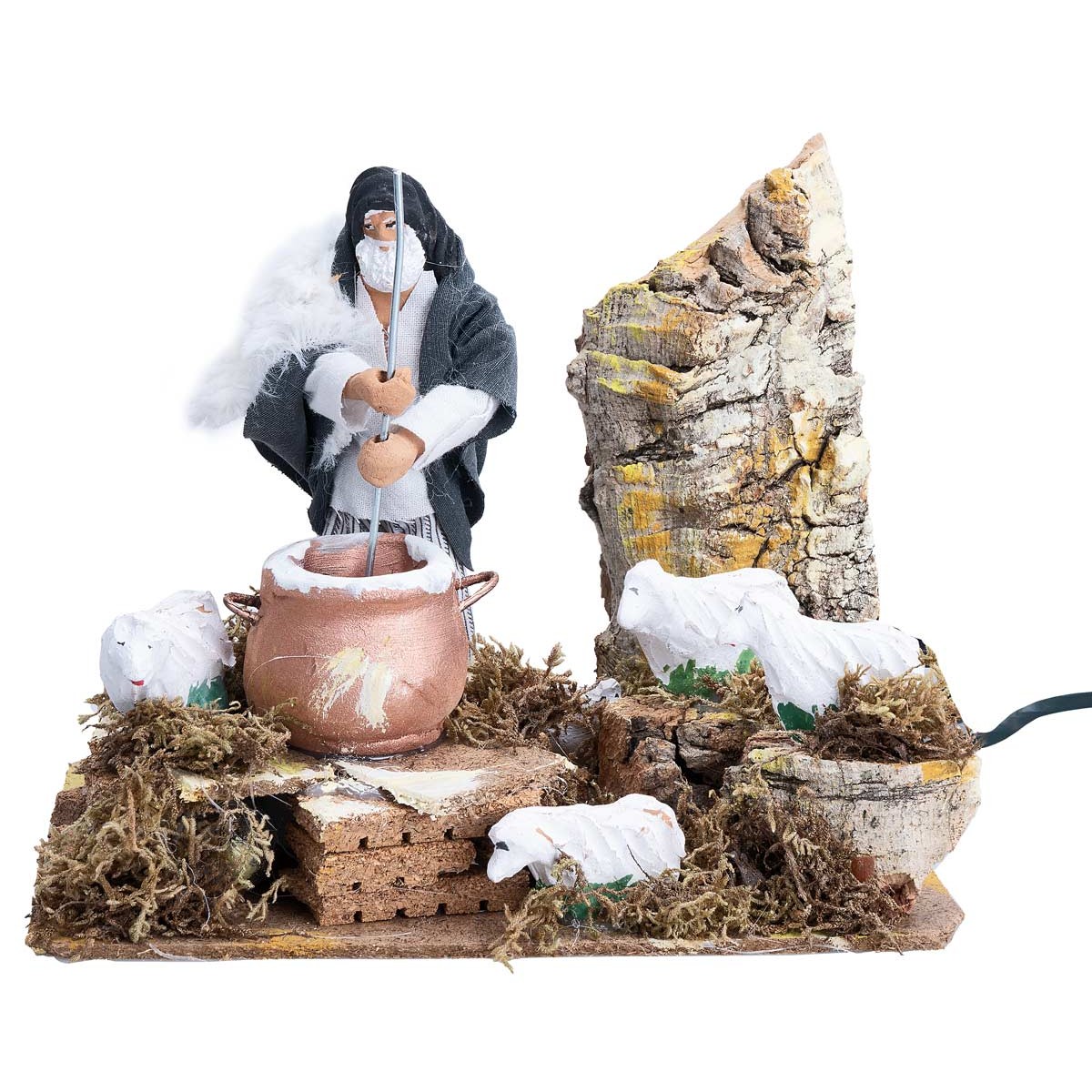 The scene depicts the artisan next to the copper cauldron: the character moves the torso simulating the action of working the ricotta, while an internal light with a fire effect illuminates the setting.