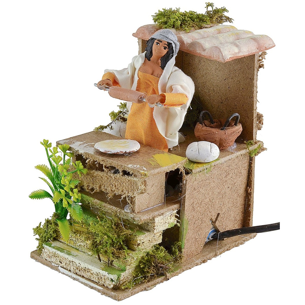 Massaia che stende l'impasto in movimento di altezza 10 cm. La donna grazie al movimento del busto su e giù simula l'azione di tirare la pasta col mattarello. Nell'ambientazione per presepe sono presenti ciuffetti di vegetazione. La statua è di terracotta con abiti in tessuto, i colori dei vestiti e del viso possono variare rispetto alla foto. L'articolo è funzionante a corrente ed è stato realizzato interamente a mano da artigiani italiani con legno sughero terracotta.