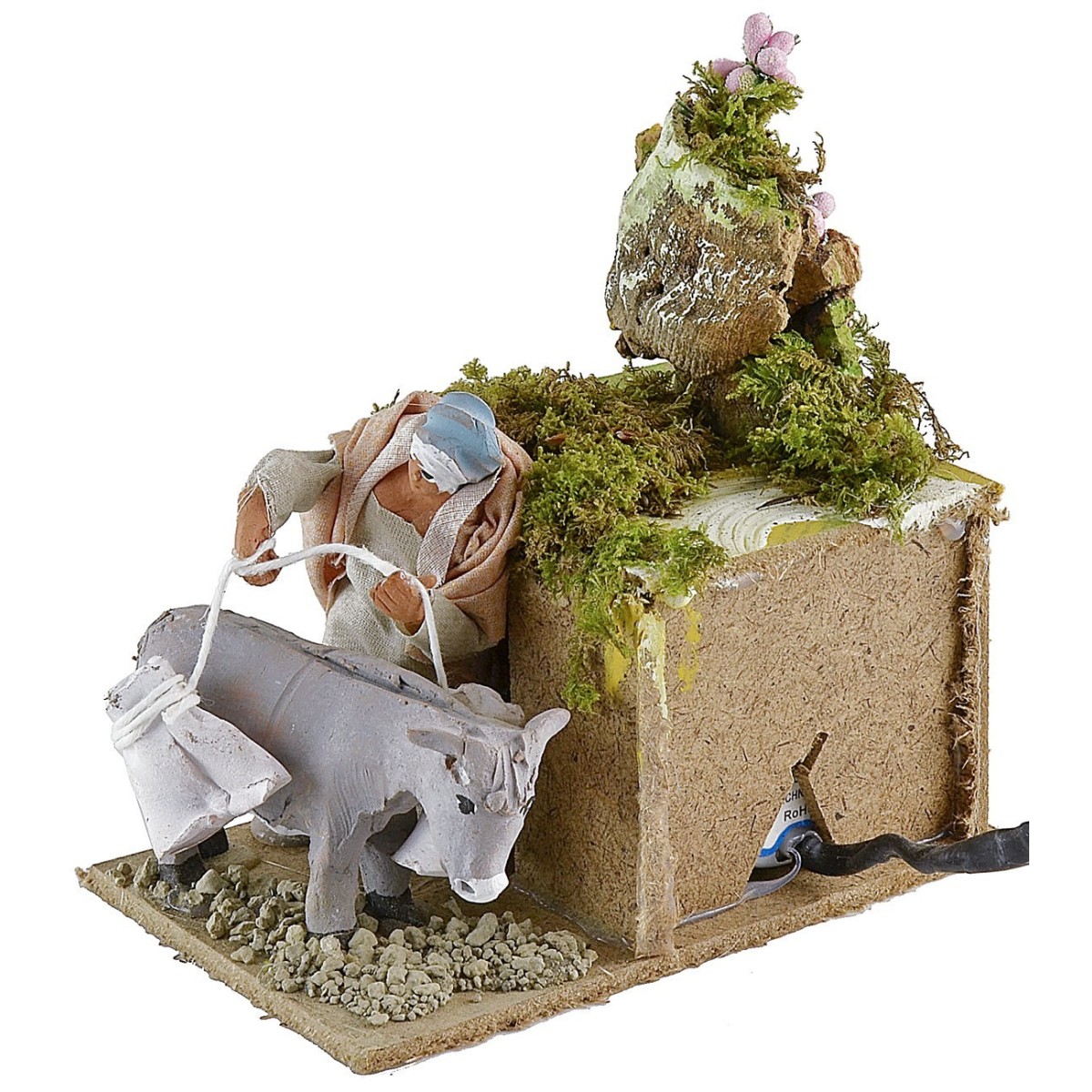 Contadina in movimento di altezza 10 cm con asino. La donna grazie al movimento del busto su e giù simula l'azione di caricare l'animale. Nell'ambientazione per presepe sono presenti ciuffetti di vegetazione. La statua è di terracotta con abiti in tessuto, i colori dei vestiti e del viso possono variare rispetto alla foto. L'articolo è funzionante a corrente ed è stato realizzato interamente a mano da artigiani italiani con legno sughero terracotta.