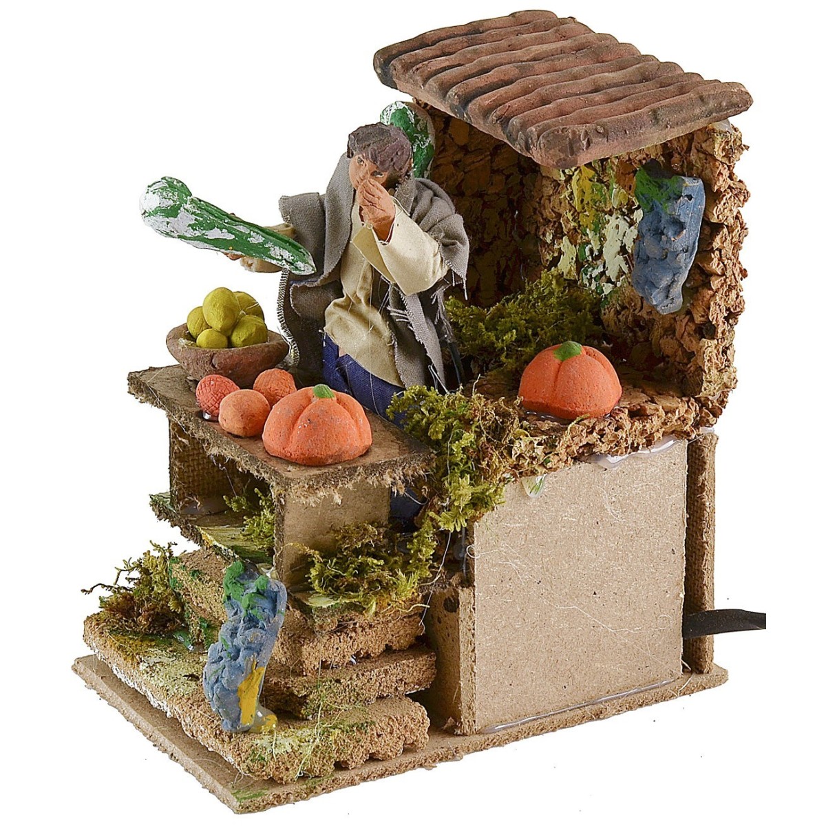 Fruit and vegetable seller with a height of 10 cm. The man, thanks to the up-and-down movement of the torso, hands the goods to the buyer. The nativity scene setting includes tufts of vegetation. The statue is made of terracotta with fabric clothing, and the colors of the clothes and face may vary from the photo. The item is powered by electricity and has been entirely handmade by Italian artisans using cork wood and terracotta.