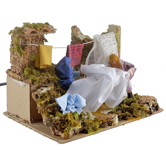 Women hanging laundry with a height movement of 12 cm. The housewives simulate the action of beating the clothes to hang them on the line through the up and down movement of the torso. In the nativity scene setting, there are tufts of vegetation. The statue is made of terracotta with fabric clothing, and the colors of the clothes and the face may vary from the picture. The item is powered by electricity and has been entirely handmade by Italian artisans using cork wood and terracotta.