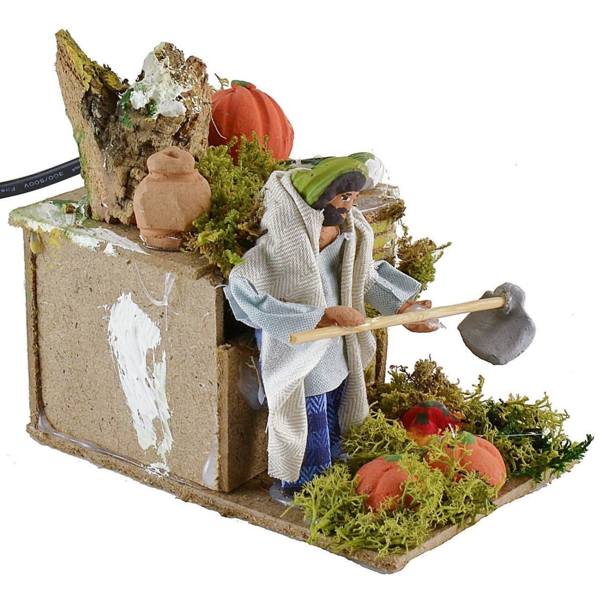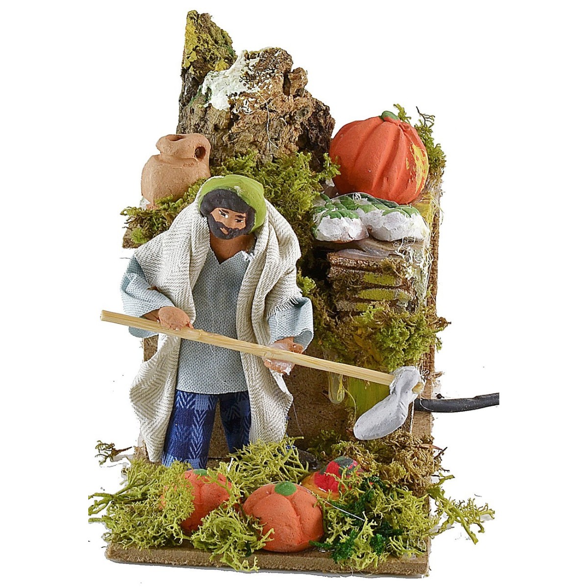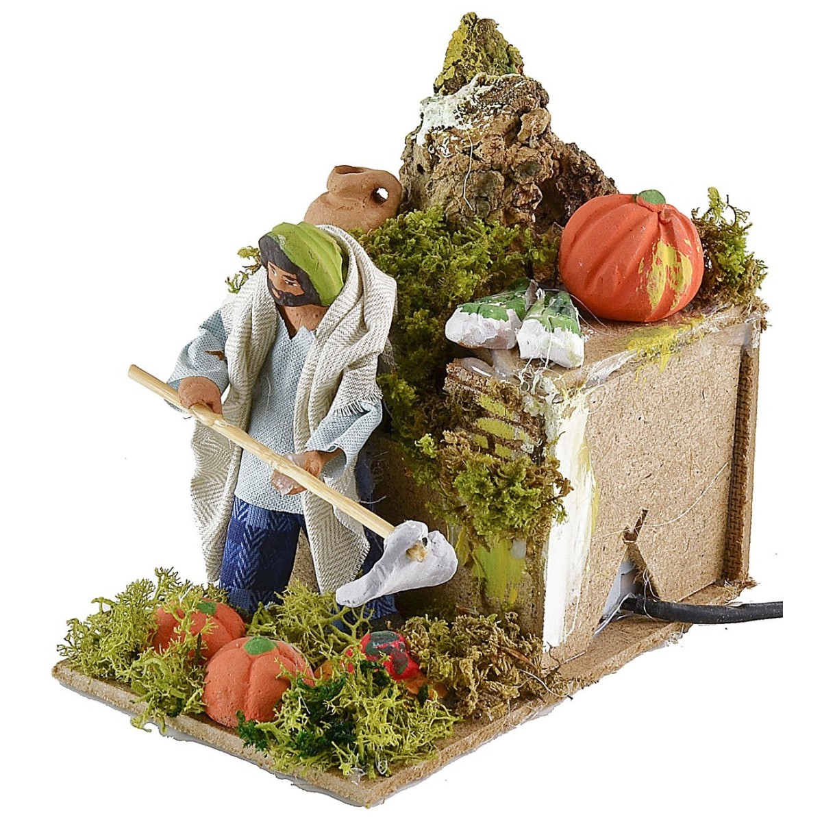 Farmer hoeing in motion with a height of 10 cm. The man, thanks to the wave-like movement, simulates the action of working the cultivated land. In the nativity scene setting, there are tufts of vegetation. The statue is made of terracotta with fabric clothes; the colors of the clothes and face may vary from the photo. The item is powered by electricity and was entirely handmade by Italian artisans using cork wood and terracotta.