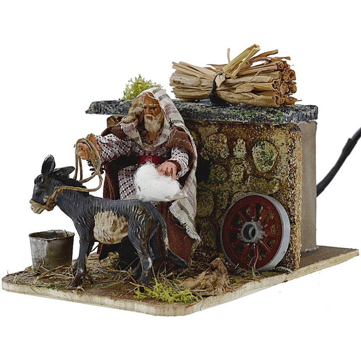 Man grooming the moving donkey, running on electricity. Moving statue for nativity scene made of terracotta dressed in fabric, height 8 cm. Being items made entirely by hand, the colors of the clothes and some small details may vary from the photo of the product.